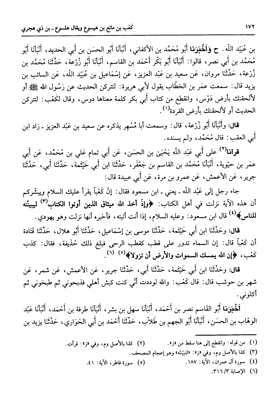 بن عبيد الله ح وأخبرنا أبو محمد بن الأكفاني أنبأنا أبو الحسن بن أبي الحديد أنبأنا أبو محمد بن أبي نصر قالوا أنبأنا أبو بكر أحمد بن القاسم أنبأنا أبو زرعة حدثنا محمد بن زرعة حدثنا مروان عن سعيد بن عبد العزيز عن إسماعيل بن عبيد الله عن السائب بن يزيد قال سمعت عمر بن الخطاب يقول لأبي هريرة لتتركن الحديث عن رسول الله (صلى الله عليه وسلم) أو لألحقنك بأرض دوس وانقطع من كتاب أبي بكر كلمة معناها دوس وقال لكعب لتتركن الحديث أو لألحقنك بأرض القردة (1) قال وأنبأنا أبو زرعة قال وسمعت أبا مسهر يذكره عن سعيد بن عبد العزيز زاد ابن أبي العقب قال محمد ولم يسنده قرأنا (2) على ابي عبد الله يحيى بن الحسن عن أبي تمام علي بن محمد عن أبي عمر بن حيوية أنبأنا محمد بن القاسم بن جعفر حدثنا ابن أبي خيثمة حدثنا أبي حدثنا جرير عن الأعمش عن عمرو بن مرة عن أبي عبيدة قال جاء رجل إلى عبد الله يعني ابن مسعود فقال إن كعبا يقرأ عليك السلام ويبشركم أن هذه الآية نزلت في أهل الكتاب " وإذ أخذ الله ميثاق الذين أوتوا الكتاب (3) ليبيننه للناس " (4) قال ابن مسعود وعليه السلام إذا أنت أتيته فأخبره أنها نزلت وهو يهودي قال وحدثنا ابن أبي خيثمة حدثنا موسى بن إسماعيل حدثنا أبو هلال حدثنا قتادة أن كعبا قال إن السماء تدور على قطب كقطب الرحى فبلغ ذلك حذيفة فقال كذب كعب " إن الله يمسك السموات والأرض أن تزولا " (5) (6) قال وحدثنا ابن أبي خيثمة حدثنا أبي حدثنا جرير عن الأعمش عن شمر عن شهر بن حوشب قال قال كعب والله لوددت أني كنت كبش أهلي فذبحوني ثم طبخوني ثم أكلوني أخبرنا أبو القاسم نصر بن أحمد أنبأنا سهل بن بشر أنبأنا طرفة بن أحمد أنبأنا عبد الوهاب بن الحسن أنبأنا أبو الجهم بن طلاب حدثنا أحمد بن أبي الحواري حدثنا يزيد بن