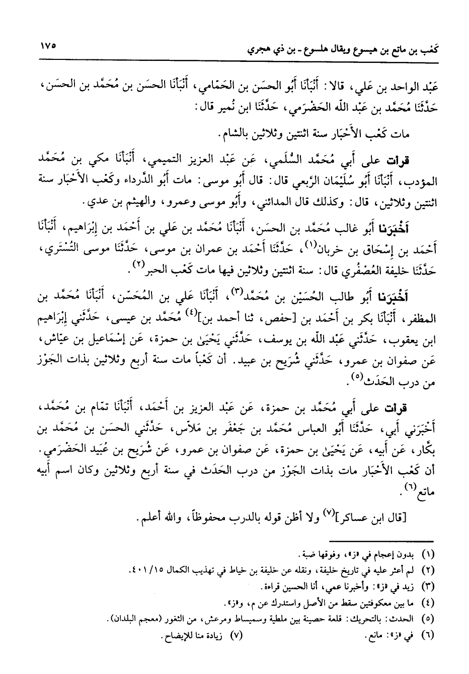 عبد الواحد بن علي قالا أنبأنا أبو الحسن بن الحمامي أنبأنا الحسن بن محمد بن الحسن حدثنا محمد بن عبد الله الحضرمي حدثنا ابن نمير قال مات كعب الأحبار سنة اثنتين وثلاثين بالشام قرأت على أبي محمد السلمي عن عبد العزيز التميمي أنبأنا مكي بن محمد المؤدب أنبأنا أبو سليمان الربعي قال قال أبو موسى مات أبو الدرداء وكعب الأحبار سنة اثنتين وثلاثين قال وكذلك قال المدائني وأبو موسى وعمرو والهيثم بن عدي أخبرنا أبو غالب محمد بن الحسن أنبأنا محمد بن علي بن أحمد بن إبراهيم أنبأنا أحمد بن إسحاق بن خربان (1) حدثنا أحمد بن عمران بن موسى حدثنا موسى التستري حدثنا خليفة العصفري قال سنة اثنتين وثلاثين فيها مات كعب الحبر (2) أخبرنا أبو طالب الحسين بن محمد (3) أنبأنا علي بن المحسن أنبأنا محمد بن المظفر أنبأنا بكر بن أحمد بن حفص ثنا أحمد بن (4) محمد بن عيسى حدثني إبراهيم ابن يعقوب حدثني عبد الله بن يوسف حدثني يحيى بن حمزة عن إسماعيل بن عياش عن صفوان بن عمرو حدثني شريح بن عبيد أن كعبا مات سنة أربع وثلاثين بذات الجوز من درب الحدث (5) قرأت على أبي محمد بن حمزة عن عبد العزيز بن أحمد أنبأنا تمام بن محمد أخبرني أبي حدثنا أبو العباس محمد بن جعفر بن ملاس حدثني الحسن بن محمد بن بكار عن أبيه عن يحيى بن حمزة عن صفوان بن عمرو عن شريح بن عبيد الحضرمي أن كعب الأحبار مات بذات الجوز من درب الحدث في سنة أربع وثلاثين وكان اسم أبيه ماتع (6) قال ابن عساكر (7) ولا أظن قوله بالدرب محفوظا والله أعلم