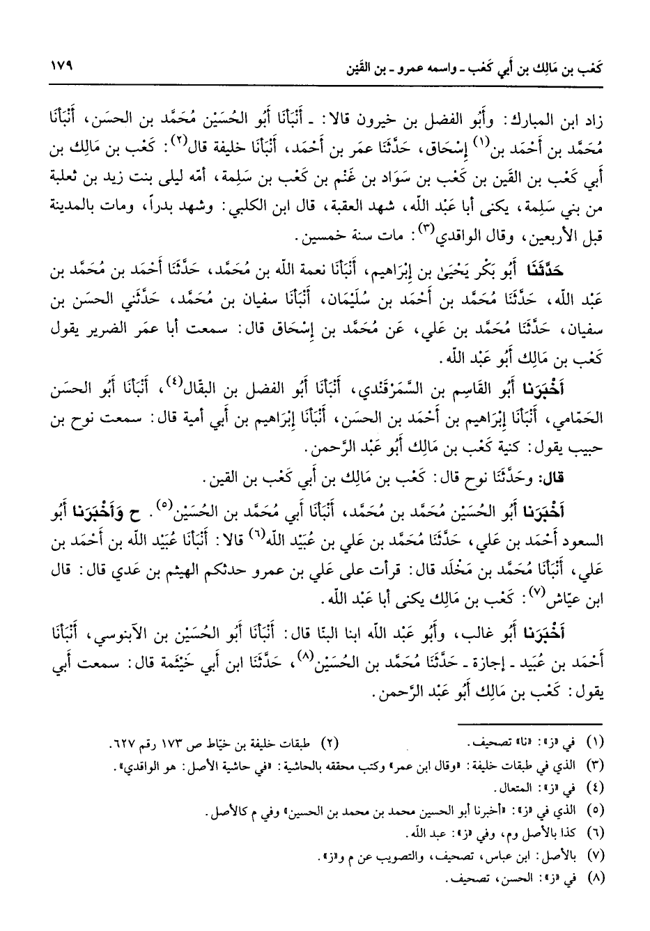 زاد ابن المبارك وأبو الفضل بن خيرون قالا أنبأنا أبو الحسين محمد بن الحسن أنبأنا محمد بن أحمد بن (1) إسحاق حدثنا عمر بن أحمد أنبأنا خليفة قال (2) كعب بن مالك بن أبي كعب بن القين بن كعب بن سواد بن غنم بن كعب بن سلمة أمه ليلى بنت زيد بن ثعلبة من بني سلمة يكنى أبا عبد الله شهد العقبة قال ابن الكلبي وشهد بدرا ومات بالمدينة قبل الأربعين وقال الواقدي (3) مات سنة خمسين حدثنا أبو بكر يحيى بن إبراهيم أنبأنا نعمة الله بن محمد حدثنا أحمد بن محمد بن عبد الله حدثنا محمد بن أحمد بن سليمان أنبأنا سفيان بن محمد حدثني الحسن بن سفيان حدثنا محمد بن علي عن محمد بن إسحاق قال سمعت أبا عمر الضرير يقول كعب بن مالك أبو عبد الله أخبرنا أبو القاسم بن السمرقندي أنبأنا أبو الفضل بن البقال (4) أنبأنا أبو الحسن الحمامي أنبأنا إبراهيم بن أحمد بن الحسن أنبأنا إبراهيم بن أبي أمية قال سمعت نوح بن حبيب يقول كنية كعب بن مالك أبو عبد الرحمن قال وحدثنا نوح قال كعب بن مالك بن أبي كعب بن القين أخبرنا أبو الحسين محمد بن محمد أنبأنا أبي محمد بن الحسين (5) ح وأخبرنا أبو السعود أحمد بن علي حدثنا محمد بن علي بن عبيد الله (6) قالا أنبأنا عبيد الله بن أحمد بن علي أنبأنا محمد بن مخلد قال قرأت على علي بن عمرو حدثكم الهيثم بن عدي قال قال ابن عياش (7) كعب بن مالك يكنى أبا عبد الله أخبرنا أبو غالب وأبو عبد الله ابنا البنا قال أنبأنا أبو الحسين بن الآبنوسي أنبأنا أحمد بن عبيد إجازة حدثنا محمد بن الحسين (8) حدثنا ابن أبي خيثمة قال سمعت أبي يقول كعب بن مالك أبو عبد الرحمن