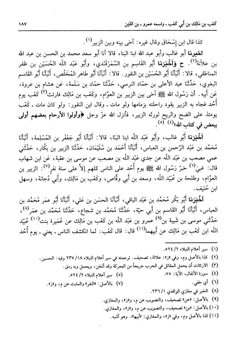 كذا قال ابن إسحاق وقال غيره آخى بينه وبين الزبير (1) أخبرنا أبو غالب وأبو عبد الله ابنا البنا قالا أنا أبو سعد محمد بن الحسن بن عبد الله بن علانة (2) ح وأخبرنا أبو القاسم بن السمرقندي وأبو عبد الله الحسين بن ظفر المناطقي قالا أنبأنا أبو الحسين بن النقور قالا أنبأنا أبو طاهر المخلص أنبأنا أبو القاسم البغوي حدثنا عبد الأعلى بن حماد النرسي حدثنا حماد بن سلمة عن هشام بن عروة عن أبيه أن رسول الله (صلى الله عليه وسلم) آخى بين الزبير بن العوام وكعب بن مالك فارتث (3) كعب يوم أحد فجاء به الزبير يقود راحلته بزمامها ولو مات وقال ابن النقور ولو كان مات كعب يومئذ على الضح والريح لورثه الزبير فأنزل الله عز وجل " وأولوا الأرحام بعضهم أولى ببعض في كتاب الله " (4) (5) أخبرنا أبو غالب وأبو عبد الله ابنا البنا قالا أنبأنا أبو جعفر بن المسلمة أنبأنا محمد بن عبد الرحمن بن العباس أنبأنا أحمد بن سليمان حدثنا الزبير بن بكار حدثني عمي مصعب بن عبد الله عن جدي عبد الله بن معصب عن موسى بن عقبة عن ابن شهاب قال غبي (6) خبر رسول الله (صلى الله عليه وسلم) يوم أحد على الناس كلهم إلا على ستة نفر (7) الزبير بن العوام وطلحة بن عبيد الله وسعد بن أبي وقاص وكعب بن مالك وأبي دجانة وسهل بن حنيف أخبرنا أبو بكر محمد بن عبد الباقي أنبأنا الحسن بن علي أنبأنا أبو عمر محمد بن العباس أنبأنا أبو القاسم بن أبي حية حدثنا محمد بن شجاع حدثنا محمد بن عمر (8) حدثني موسى بن شيبة بن (9) عمرو بن عبد الله بن كعب بن مالك عن عميرة بنت (10) عبيد الله بن كعب بن مالك عن أبيهما (11) قال قال كعب لما انكشف الناس يعني يوم أحد