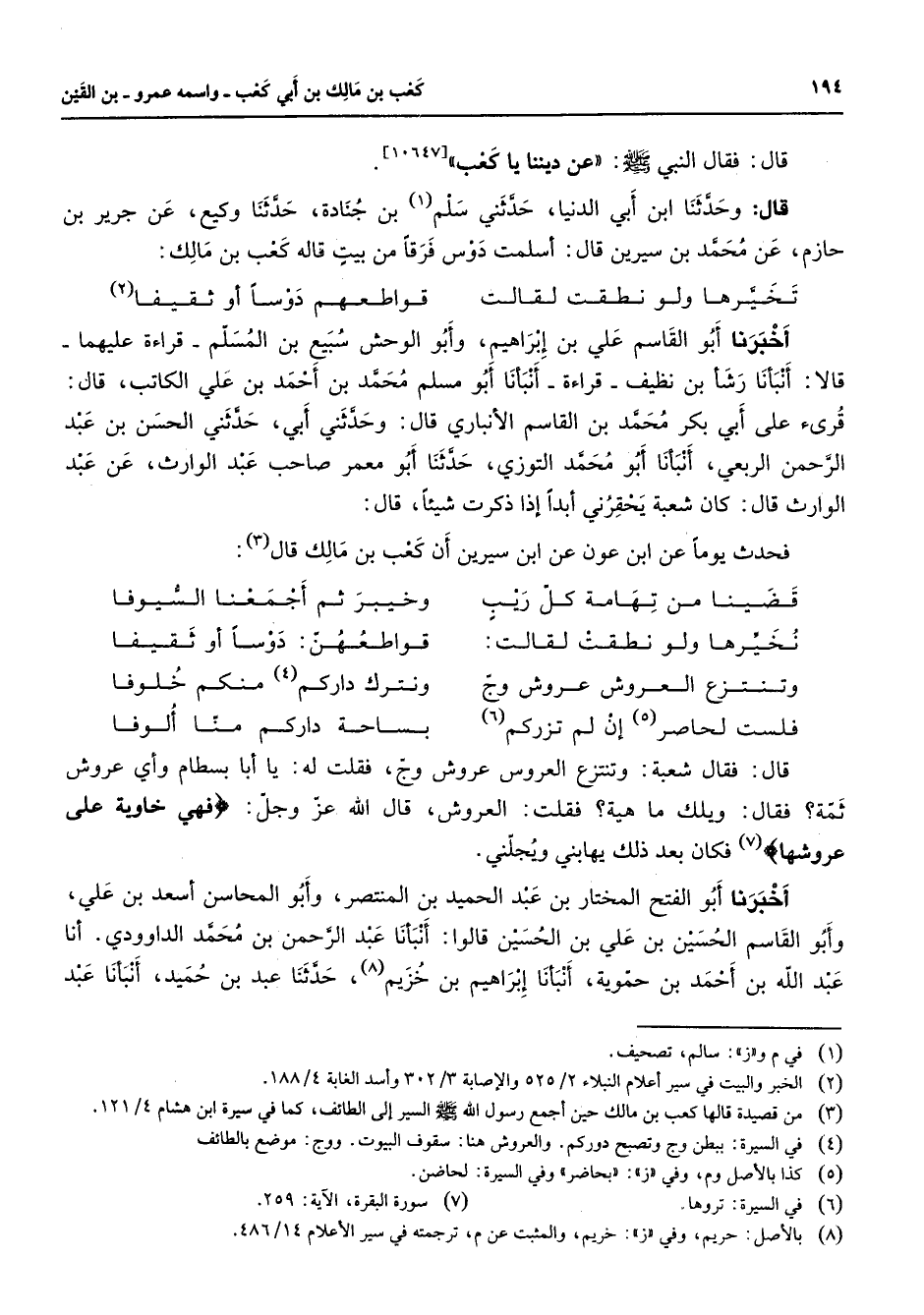 [10647] قال وحدثنا ابن أبي الدنيا حدثني سلم (1) بن جنادة حدثنا وكيع عن جرير بن حازم عن محمد بن سيرين قال أسلمت دوس فرقا من بيت قاله كعب بن مالك: تخيرها ولو نطقت لقالت * قواطعهم دوسا أو ثقيفا (2) أخبرنا أبو القاسم علي بن إبراهيم وابو الوحش سبيع بن المسلم قراءة عليهما قالا أنبأنا رشأ بن نظيف قراءة أنبأنا أبو مسلم محمد بن أحمد بن علي الكاتب قال قرئ على أبي بكر محمد بن القاسم الأنباري قال وحدثني أبي حدثني الحسن بن عبد الرحمن الربعي أنبأنا أبو محمد التوزي حدثنا أبو معمر صاحب عبد الوارث عن عبد الوارث قال كان شعبة يحقرني أبدا إذا ذكرت شيئا قال فحدث يوما عن ابن عون عن ابن سيرين أن كعب بن مالك قال (3) : قضينا من تهامة كل ريب * وخيبر ثم أجمعنا السيوفا نخيرها ولو نطقت لقالت * قواطعهن دوسا أو ثقيفا وتنتزع العروش عروش وج * ونترك داركم (4) منكم خلوفا فلست لحاصر (5) إن لم تزركم (6) * بساحة داركم منا ألوفا قال فقال شعبة وتنتزع العروس عروش وج فقلت له يا أبا بسطام وأي عروش ثمة فقال ويلك ما هية فقلت العروش قال الله عز وجل " فهي خاوية على عروشها " (7) فكان بعد ذلك يهابني ويجلني أخبرنا أبو الفتح المختار بن عبد الحميد بن المنتصر وأبو المحاسن أسعد بن علي وأبو القاسم الحسين بن علي بن الحسين قالوا أنبأنا عبد الرحمن بن محمد الداوودي أنا عبد الله بن أحمد بن حموية أنبأنا إبراهيم بن خزيم (8) حدثنا عبد بن حميد أنبأنا عبد
