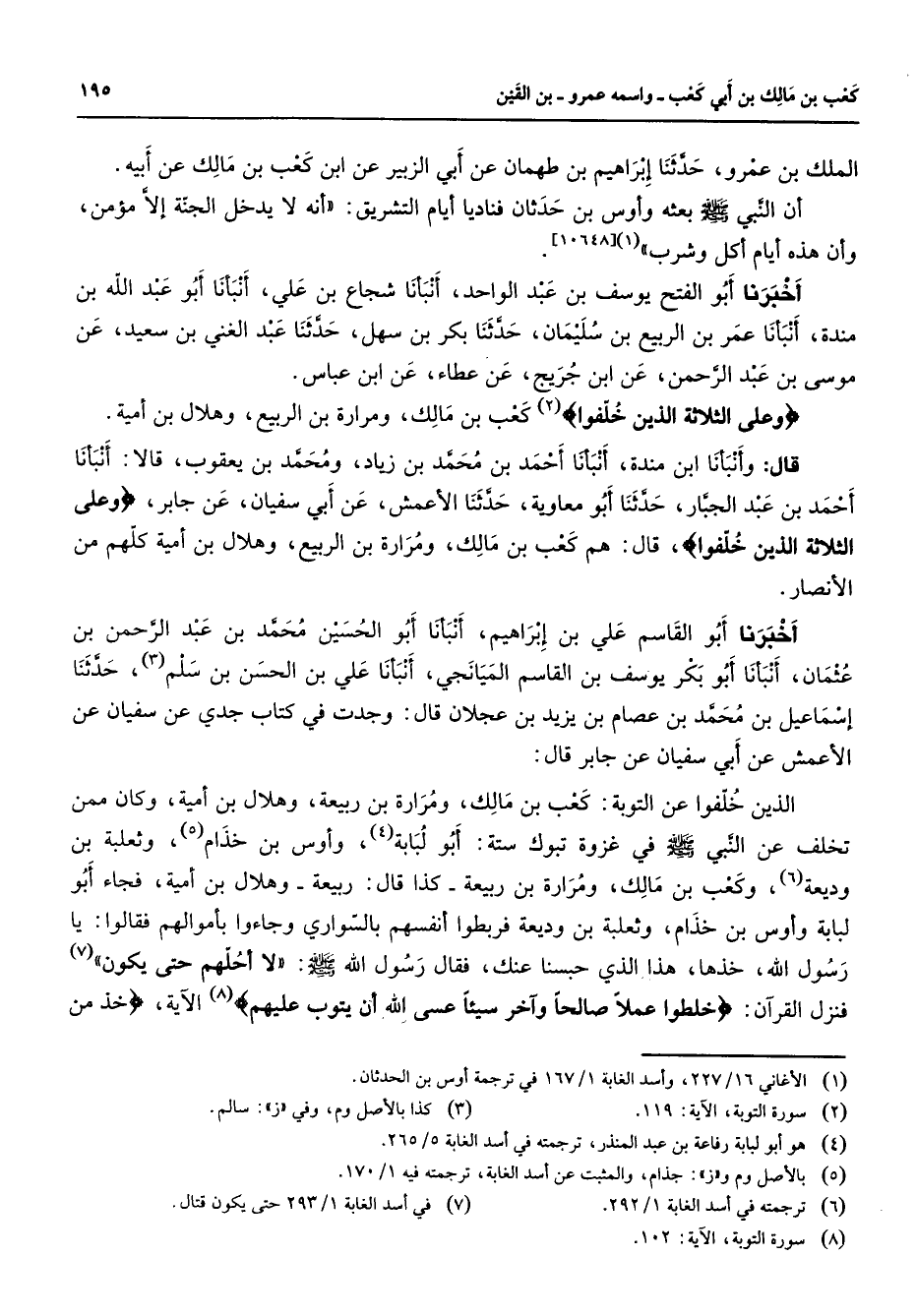 [10648] أخبرنا أبو الفتح يوسف بن عبد الواحد أنبأنا شجاع بن علي أنبأنا أبو عبد الله بن مندة أنبأنا عمر بن الربيع بن سليمان حدثنا بكر بن سهل حدثنا عبد الغني بن سعيد عن موسى بن عبد الرحمن عن ابن جريج عن عطاء عن ابن عباس " وعلى الثلاثة الذين خلفوا " (2) كعب بن مالك ومرارة بن الربيع وهلال بن أمية قال وأنبأنا ابن مندة أنبأنا أحمد بن محمد بن زياد ومحمد بن يعقوب قالا أنبأنا أحمد بن عبد الجبار حدثنا أبو معاوية حدثنا الأعمش عن أبي سفيان عن جابر " وعلى الثلاثة الذين خلفوا " قال هم كعب بن مالك ومرارة بن الربيع وهلال بن أمية كلهم من الأنصار أخبرنا أبو القاسم علي بن إبراهيم أنبأنا أبو الحسين محمد بن عبد الرحمن بن عثمان أنبأنا أبو بكر يوسف بن القاسم الميانجي أنبأنا علي بن الحسن بن سلم (3) حدثنا إسماعيل بن محمد بن عصام بن يزيد بن عجلان قال وجدت في كتاب جدي عن سفيان عن الأعمش عن أبي سفيان عن جابر قال الذين خلفوا عن التوبة كعب بن مالك مرارة بن ربيعة وهلال بن أمية وكان ممن تخلف عن النبي (صلى الله عليه وسلم) في غزوة تبوك ستة أبو لبابة (4) وأوس بن خذام (5) وثعلبة بن وديعة (6) وكعب بن مالك ومرارة بن ربيعة كذا قال ربيعة وهلال بن أمية فجاء أبو لبابة وأوس بن خذام وثعلبة بن وديعة فربطوا أنفسهم بالسواري وجاءوا بأموالهم فقالوا يا رسول الله خذها هذا الذي حبسنا عنك فقال رسول الله (صلى الله عليه وسلم) لا أحلهم حتى يكون (7) فنزل القرآن " خلطوا عملا صالحا وآخر سيئا عسى الله أن يتوب عليهم " (8) الآية " خذ من