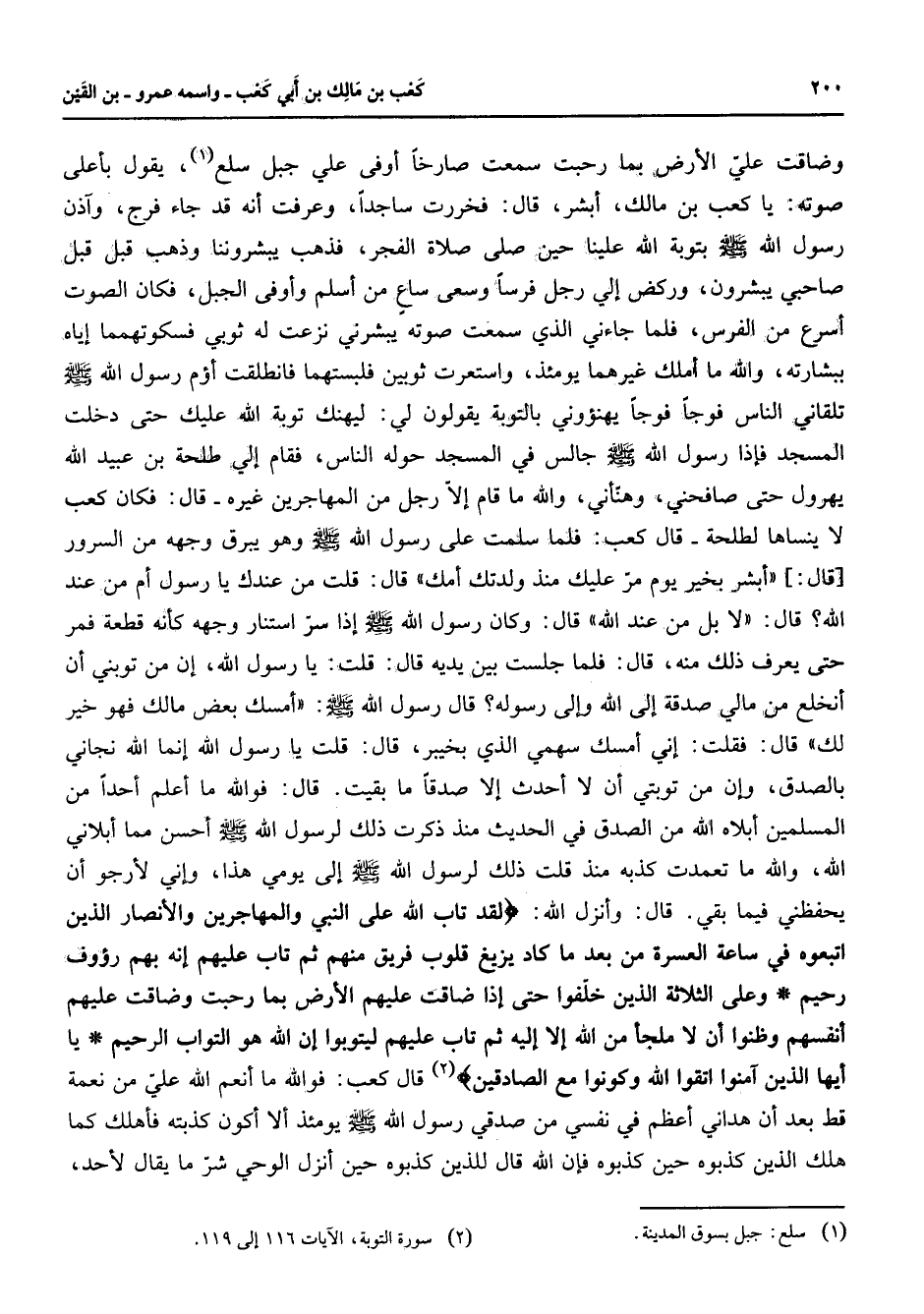 وضاقت علي الأرض بما رحبت سمعت صارخا أوفى علي جبل سلع (1) يقول بأعلى صوته يا كعب بن مالك أبشر قال فخررت ساجدا وعرفت أنه قد جاء فرج وآذن رسول الله (صلى الله عليه وسلم) بتوبة الله علينا حين صلى صلاة الفجر فذهب يبشروننا وذهب قبل قبل صاحبي يبشرون وركض إلي رجل فرسا وسعى ساع من أسلم وأوفى الجبل فكان الصوت أسرع من الفرس فلما جاءني الذي سمعت صوته يبشرني نزعت له ثوبي فسكوتهمما إياه ببشارته والله ما أملك غيرهما يومئذ واستعرت ثوبين فلبستهما فانطلقت أؤم رسول الله (صلى الله عليه وسلم) تلقاني الناس فوجا فوجا فهنؤوني بالتوبة يقولون لي ليهنك توبة الله عليك حتى دخلت المسجد فإذا رسول الله (صلى الله عليه وسلم) جالس في المسجد حوله الناس فقام إلي طلحة بن عبيد الله يهرول حتى صافحني وهنأني والله ما قام إلا رجل من المهاجرين غيره قال فكان كعب لا ينساها لطلحة قال كعب فلما سلمت على رسول الله (صلى الله عليه وسلم) وهو يبرق وجهه من السرور قال أبشر بخير يوم مر عليك منذ ولدتك أمك قال قلت من عندك يا رسول أم من عند الله قال لا بل من عند لله قال وكان رسول الله (صلى الله عليه وسلم) إذا سر استنار وجهه كأنه قطعة فمر حتى يعرف ذلك منه قال فلما جلست بين يديه قال قلت يا رسول الله إن من توبني أن أنخلع من مالي صدقة إلى الله وإلى رسوله قال رسول الله (صلى الله عليه وسلم) أمسك بعض مالك فهو خير لك قال فقلت إنس أمسك سهمي الذي بخيبر قال قلت يا رسول الله إنما الله نجاني بالصدق وإن من توبتي أن لا أحدث إلا صدقا ما بقيت قال فوالله ما أعلم أحدا من المسلمين أبلاه الله من الصدق في الحديث منذ ذكرت ذلك لرسول الله (صلى الله عليه وسلم) أحسن مما أبلاني الله والله ما تعمدت كذبه منذ قلت ذلك لرسول الله (صلى الله عليه وسلم) إلى يومي هذا وإني لأرجو أن يحفظني فيما بقي قال وأنزل الله " لقد تاب الله على النبي والمهاجرين والأنصار الذين اتبعوه في ساعة العسرة من بعد ما كاد يزيغ قلوب فريق منهم ثم تاب عليهم إنه بهم رؤوف رحيم وعلى الثلاثة الذين خلفوا حتى إذا ضاقت عليهم الأرض بما رحبت وضاقت عليهم أنفسهم وظنوا أن لا ملجأ من الله إلا إليه ثم تاب عليهم ليتوبوا إن الله هو التواب الرحيم يا أيها الذين آمنوا اتقوا الله وكونوا مع الصادقين " (2) قال كعب فوالله ما أنعم الله علي من نعمة قط بعد أن هداني أعظم في نفسي من صدقي رسول الله (صلى الله عليه وسلم) يومئذ ألا أكون كذبته فأهلك كما هلك الذين كذبوه حين كذبوه فإن الله قال للذين كذبوه حين أنزل الوحي شر ما يقال لأحد