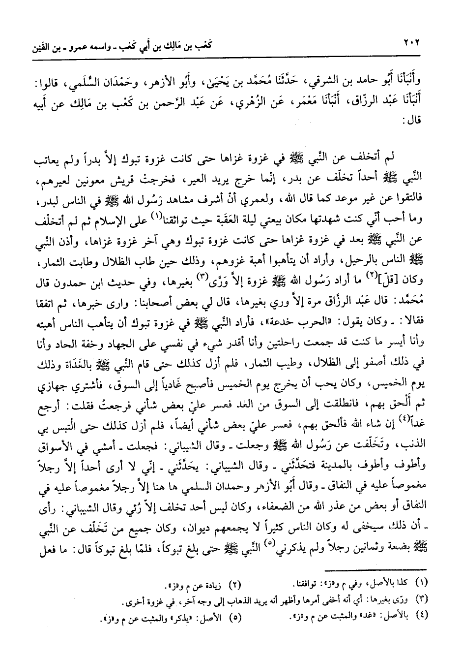 وأنبانا أبو حامد بن الشرقي حدثنا محمد بن يحيى وأبو الأزهر وحمدان السلمي قالوا أنبأنا عبد الرزاق أنبأنا معمر عن الزهري عن عبد الرحمن بن كعب بن مالك عن أبيه قال لم أتخلف عن النبي (صلى الله عليه وسلم) في غزوة غزاها حتى كانت غزوة تبوك إلا بدرا ولم يعاتب النبي (صلى الله عليه وسلم) أحدا تخلف عن بدر إنما خرج يريد العير فخرجت قريش معونين لعيرهم فالتقوا عن غير موعد كما قال الله ولعمري أن أشرف مشاهد رسول الله (صلى الله عليه وسلم) في الناس لبدر وما أحب أني كنت شهدتها مكان بيعتي ليلة العقبة حيث تواثقنا (1) على الإسلام ثم لم أتخلف عن النبي (صلى الله عليه وسلم) بعد في غزوة غزاها حتى كانت غزوة تبوك وهي آخر غزوة غزاها وأذن النبي (صلى الله عليه وسلم) الناس بالرحيل وأراد أن يتأهبوا أهبة غزوهم وذلك حين طاب الظلال وطابت الثمار وكان قل (2) ما أراد رسول الله (صلى الله عليه وسلم) غزوة إلا ورى (3) بغيرها وفي حديث ابن حمدون قال محمد قال عبد الرزاق مرة إلا وري بغيرها قال لي بعض أصحابنا وارى خبرها ثم اتفقا فقالا وكان يقول الحرب خدعة فأراد النبي (صلى الله عليه وسلم) في غزوة تبوك أن يتأهب الناس أهبته وأنا أيسر ما كنت قد جمعت راحلتين وأنا أقدر شئ في نفسي على الجهاد وخفة الحاد وأنا في ذلك أصفو إلى الظلال وطيب الثمار فلم أزل كذلك حتى قام النبي (صلى الله عليه وسلم) بالغداة وذلك يوم الخميس وكان يحب أن يخرج يوم الخميس فأصبح غاديا إلى السوق فأشتري جهازي ثم ألحق بهم فانطلقت إلى السوق من الغد فعسر علي بعض شأني فرجعت فقلت أرجع غدا (4) إن شاء الله فألحق بهم فعسر علي بعض شأني أيضا فلم أزل كذلك حتى التبس بي الذنب وتخلفت عن رسول الله (صلى الله عليه وسلم) وجعلت وقال الشيباني فجعلت أمشي في الأسواق وأطوف وأطوف بالمدينة فتحدثني وقال الشيباني يحدثني أني لا أرى أحدا إلا رجلا مغموصا عليه في النفاق وقال أبو الأزهر وحمدان السلمي هاهنا إلا رجلا مغموصا عليه في النفاق أو بعض من عذر الله من الضعفاء وكان ليس أحد تخلف إلا رئي وقال الشيباني رأى أن ذلك سيخفى له وكان الناس كثيرا لا يجمعهم ديوان وكان جميع من تخلف عن النبي (صلى الله عليه وسلم) بضعة وثمانين رجلا ولم يذكرني (5) النبي (صلى الله عليه وسلم) حتى بلغ تبوكا فلما بلغ تبوكا قال ما فعل