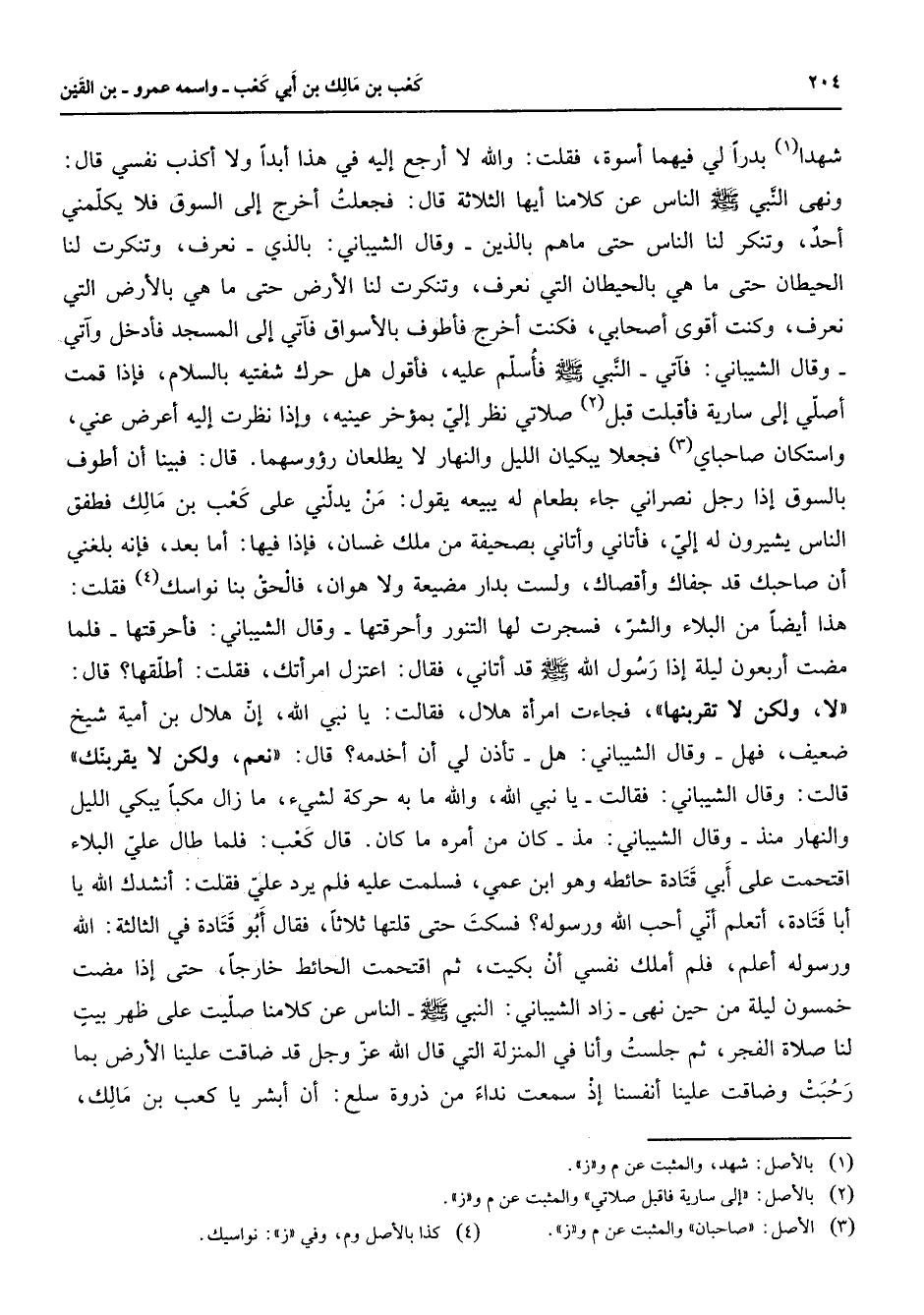 شهدا (1) بدرا لي فيهما أسوة فقلت والله لا أرجع إليه في هذا أبدا ولا أكذب نفسي قال ونهى النبي (صلى الله عليه وسلم) الناس عن كلامنا أيها الثلاثة قال فجعلت أخرج إلى السوق فلا يكلمني أحد وتنكر لنا الناس حتى ماهم بالذين وقال الشيباني بالذي نعرف وتنكرت لنا الحيطان حتى ما هي بالحيطان التي نعرف وتنكرت لنا الأرض حتى ما هي بالأرض التي نعرف وكنت أقوى أصحابي فكنت أخرج فأطوق بالأسواق فآتي إلى المسجد فأدخل وآتي وقال الشيباني فآتي النبي (صلى الله عليه وسلم) فأسلم عليه فأقول هل حرك شفتيه بالسلام فإذا قمت أصلي إلى سارية فأقبلت قبل (2) صلاتي نظر إلي بمؤخر عينيه وإذا نظرت إليه أعرض عني واستكان صاحباي (3) فجعلا يبكيان الليل والنهار لا يطلعان رؤوسهما قال بينا أنا أطوف بالسوق إذا رجل نصراني جاء بطعام له يبيعه يقول من يدلني على كعب بن مالك فطفق الناس يشيرون له إلي فأتاني وأتاني بصحيفة من ملك غسان فإذا فيها أما بعد فإنه بلغني أن صاحبك قد جفاك وأقصاك ولست بدار مضيعة ولا هوان فالحق بنا نواسك (4) فقلت هذا أيضا من البلاء والشر فسجرت لها التنور وأحرقتها وقال الشيباني فأحرقتها فلما مضت أربعون ليلة إذارسول الله (صلى الله عليه وسلم) قد أتاني فقال اعتزل امرأتك فقلت أطلقها قال لا ولكن لا تقربنها فجاءت امرأة هلال فقالت يا نبي الله إن هلال بن أمية شيخ ضعيف فهل وقال الشيباني هل تأذن لي أن أخدمه قال نعم ولكن لا يقربنك قالت وقال الشيباني فقالت يا نبي الله والله ما به حركة لشئ ما زال مكبا يبكي الليل