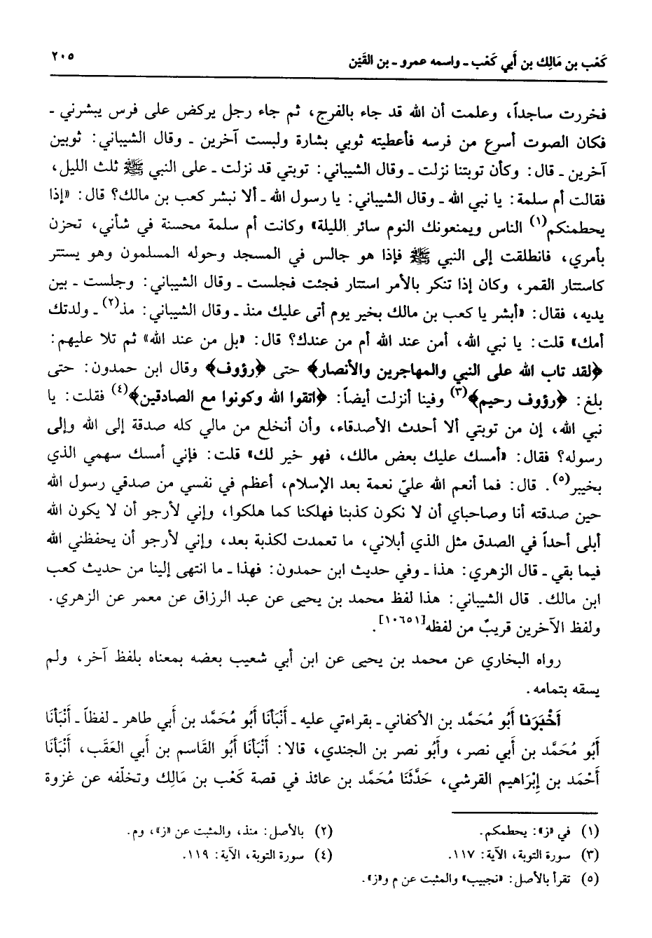 فخررت ساجدا وعلمت أن الله قد جاء بالفرج ثم جاء رجل يركض على فرس يبشرني فكان الصوت أسرع من فرسه فأعطيته ثوبي بشارة ولبست آخرين وقال الشيباني ثوبين آخرين قال وكأن توبتنا نزلت وقال الشيباني توبتي قد نزلت على النبي (صلى الله عليه وسلم) ثلث الليل فقالت أم سلمة يا نبي الله وقال الشيباني يا رسول الله ألا نبشر كعب بن مالك قال إذا يحطمنكم (1) الناس ويمنعونك النوم سائر الليلة وكانت أم سلمة محسنة في شأني تحزن بأمري فانطلقت إلى النبي (صلى الله عليه وسلم) فإذا هو جالس في المسجد وحوله المسلمون وهو يستتر كاستتار القمر وكان إذا تنكر بالأمر استتار فجئت فجلست وقال الشيباني وجلست بين يديه فقال أبشر يا كعب بن مالك بخير يوم أتى عليك منذ وقال الشيباني مذ (2) ولدتك أمك قلت يا نبي الله أمن عند الله أم من عندك قال بل من عند الله ثم تلا عليهم " لقد تاب الله على النبي والمهاجرين والأنصار " حتى " رؤوف " وقال ابن حمدون حتى بلغ " رؤوف رحيم " وفينا أنزلت أيضا " اتقوا الله وكونوا مع الصادقين " (4) فقلت يا نبي الله إن من توبتي ألا أحدث الأصدقاء وأن أنخلع من مالي كله صدقة إلى الله وإلى رسوله فقال أمسك عليك بعض مالك فهو خير لك قلت فإني أمسك سهمي الذي بخيبر (5) قال فما أنعم الله علي نعمة بعد الإسلام أعظم في نفسي من صدقي رسول الله حين صدقته أنا وصاحباي أن لا نكون كذبنا فهلكنا كما هلكوا وإني لأرجو أن لا يكون الله أبلى أحدا في الصدق مثل الذي أبلاني ما تعمدت لكذبة بعد وإني لأرجو أن يحفظني الله فيما بقي قال الزهري هذا وفي حديث ابن حمدون فهذا ما انتهى إلينا من حديث كعب ابن مالك قال الشيباني هذا لفظ محمد بن يحيى عن عبد الرزاق عن معمر عن الزهري ولفظ الآخرين قريب من لفظه
