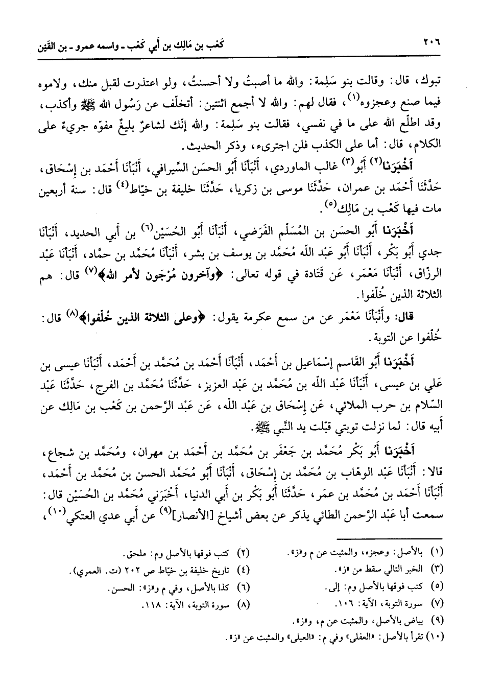 تبوك قال وقالت بنو سلمة والله ما أصبت ولا أحسنت ولو اعتذرت لقبل منك ولاموه فيما صنع وعجزوه (1) فقال لهم والله لا أجمع اثنتين أتخلف عن رسول الله (صلى الله عليه وسلم) وأكذب وقد اطلع الله على ما في نفسي فقالت بنو سلمة والله إنك لشاعر بليغ مفوه جرئ على الكلام قال أما على الكذب فلن اجترئ وذكر الحديث أخبرنا (2) أبو (3) غالب الماوردي أنبأنا أبو الحسن السيرافي أنبأنا أحمد بن إسحاق حدثنا أحمد بن عمران حدثنا موسى بن زكريا حدثنا خليفة بن خياط (4) قال سنة أربعين مات فيها كعب بن مالك (5) أخبرنا أبو الحسن بن المسلم الفرضي أنبأنا أبو الحسين (6) بن أبي الحديد أنبأنا جدي أبو بكر أنبأنا أبو عبد الله محمد بن يوسف بن بشر أنبأنا محمد بن حماد أنبأنا عبد الرزاق أنبأنا معمر عن قتادة في قوله تعالى " وآخرون مرجون لأمر الله " (7) قال هم الثلاثة الذين خلفوا قال وأنبأنا معمر عن من سمع عكرمة يقول " وعلى الثلاثة الذين خلفوا " (8) قال خلفوا عن التوبة أخبرنا أبو القاسم إسماعيل بن أحمد أنبأنا أحمد بن محمد بن أحمد أنبأنا عيسى بن علي بن عيسى أنبأنا عبد الله بن محمد بن عبد العزيز حدثنا محمد بن الفرج حدثنا عبد السلام بن حرب الملائي عن إسحاق بن عبد الله عن عبد الرحمن بن كعب بن مالك عن أبيه قال لما نزلت توبتي قبلت يد النبي (صلى الله عليه وسلم) أخبرنا أبو بكر محمد بن جعفر بن محمد بن أحمد بن مهران ومحمد بن شجاع قالا أنبأنا عبد الوهاب بن محمد بن إسحاق أنبأنا أبو محمد الحسن بن محمد بن أحمد أنبأنا أحمد بن محمد بن عمر حدثنا أبو بكر بن أبي الدنيا أخبرني محمد بن الحسين قال سمعت أبا عبد الرحمن الطائي يذكر عن بعض أشياخ الأنصار (9) عن أبي عدي العتكي (10)