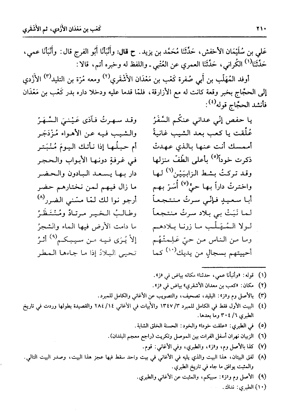 علي بن سليمان الأخفش حدثنا محمد بن يزيد ح قال وأنبأنا أبو الفرج قال وأنبأنا عمي حدثنا (1) الكراني حدثنا العمري عن العتبي واللفظ له وخبره أتم قالا أوفد المهلب بن أبي صفرة كعب بن معدان الأشقري (2) ومعه مرة بن التليد (3) الأزدي إلى الحجاج بخبر وقعة كانت له مع الأزارقة فلما قدما عليه ودخلا داره بدر كعب بن معدان فأنشد الحجاج قوله (4) : يا حفص إني عداني عنكم السفر * وقد سهرت فآذى عيني السهر علقت يا كعب بعد الشيب غانية * والشيب فيه عن الأهواء مزدجر أممسك أنت عنها بالذي عهدت * أم حبلها إذا نأتك اليوم منبتر ذكرت خودا (5) بأعلى الطف منزلها * في غرفة دونها الأبواب والحجر وقد تركت بشط الزابيين (6) لها * دار بها يسعد البادون والحضر واخترت دارا بها حي (7) أسر بهم * ما زال فيهم لمن نختارهم حضر أبا سعيد فإني سرت منتجعا * أرجو نوا لك لما مسني الضرر (8) لما نبت بي بلاد سرت منتجعا * وطالب الخير مرتاد ومنتظر لولا المهلب ما زرنا بلادهم * ما دامت الأرض فيها الماء والشجر وما من الناس من حي علمتهم * إلا يرى فيه من سيبكم (9) أثر أحييتهم بسجال من يديك (10) كما * تحيى البلاد إذا ما جاءها المطر