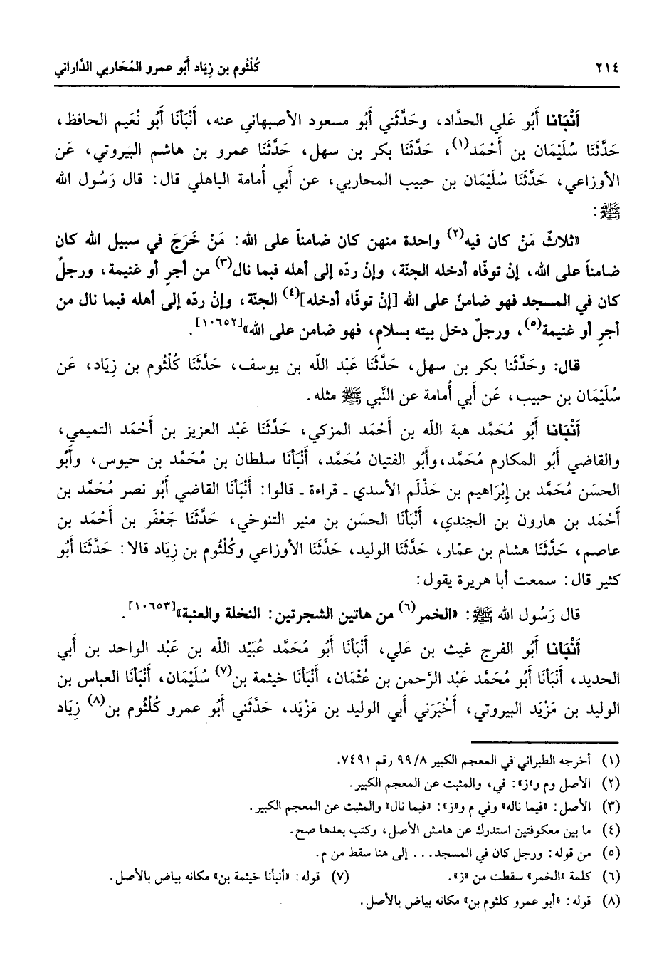 [10653] أنبأنا أبو الفرج غيث بن علي أنبأنا أبو محمد عبيد الله بن عبد الواحد بن أبي الحديد أنبأنا أبو محمد عبد الرحمن بن عثمان أنبأنا خيثمة بن (7) سليمان أنبانا العباس بن الوليد بن مزيد البيروتي أخبرني أبي الوليد بن مزيد حدثني أبو عمرو كلثوم بن (8) زياد