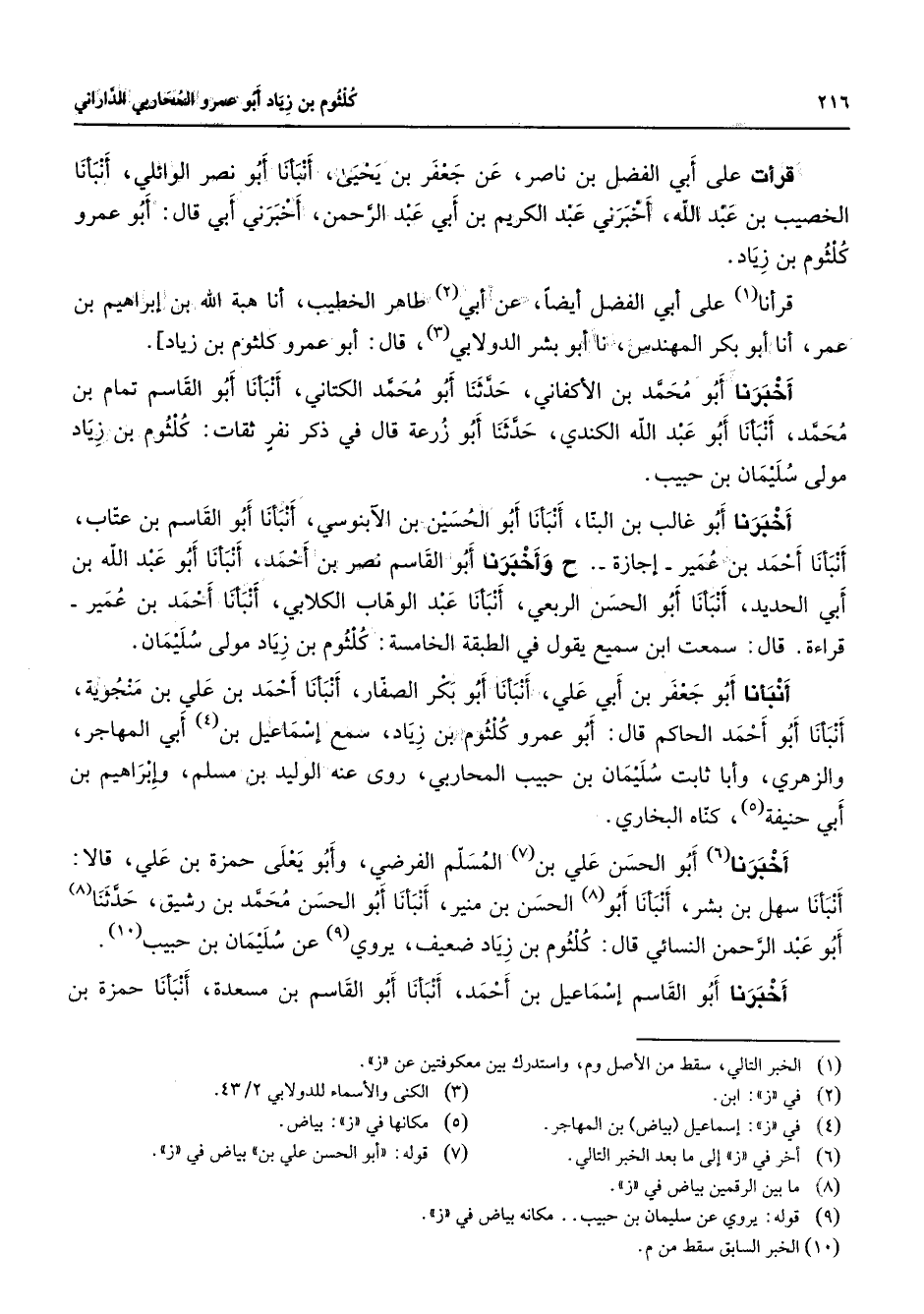 قرأت على أبي الفضل بن ناصر عن جعفر بن يحيى أنبأنا أبو نصر الوائلي أنبأنا الخصيب بن عبد الله أخبرني عبد الكريم بن أبي عبد الرحمن أخبرني أبي قال أبو عمرو كلثوم بن زياد قرأنا (1) على أبي الفضل أيضا عن أبي (2) طاهر الخطيب أنا هبة الله بن إبراهيم بن عمر أنا أبو بكر المهندس نا أبو بشر الدولابي (3) قال أبو عمرو كلثوم بن زياد أخبرنا أبو محمد بن الأكفاني حدثنا أبو محمد الكتاني أنبأنا أبو القاسم تمام بن محمد أنبأنا أبو عبد الله الكندي حدثنا أبو زرعة قال في ذكر نفر ثقات كلثوم بن زياد مولى سليمان بن حبيب أخبرنا أبو غالب بن البنا أنبأنا أبو الحسين بن الآبنوسي أنبأنا أبو القاسم بن عتاب أنبأنا أحمد بن عمير إجازة ح وأخبرنا أبو القاسم نصر بن أحمد أنبأنا أبو عبد الله بن أبي الحديد أنبأنا أبو الحسن الربعي أنبأنا عبد الوهاب الكلابي أنبأنا أحمد بن عمير قراءة قال سمعت ابن سميع يقول في الطبقة الخامسة كلثوم بن زياد مولى سليمان أنبأنا أبو جعفر بن أبي علي أنبأنا أبو بكر الصفار أنبأنا أحمد بن علي بن منجوية أنبأنا أبو أحمد الحاكم قال أبو عمرو كلثوم بن زياد سمع إسماعيل بن (4) أبي المهاجر والزهري وأبا ثابت سليمان بن حبيب المحاربي روى عنه الوليد بن مسلم وإبراهيم بن أبي حنيفة (5) كناه البخاري أخبرنا (6) أبو الحسن علي بن (7) المسلم الفرضي وأبو يعلى حمزة بن علي قالا أنبأنا سهل بن بشر أنبأنا أبو (8) الحسن بن منير أنبأنا أبو الحسن محمد بن رشيق حدثنا (8) أبو عبد الرحمن النسائي قال كلثوم بن زياد ضعيف يروي (9) عن سليمان بن حبيب (10) أخبرنا أبو القاسم إسماعيل بن أحمد أنبأنا أبو القاسم بن مسعدة أنبأنا حمزة بن