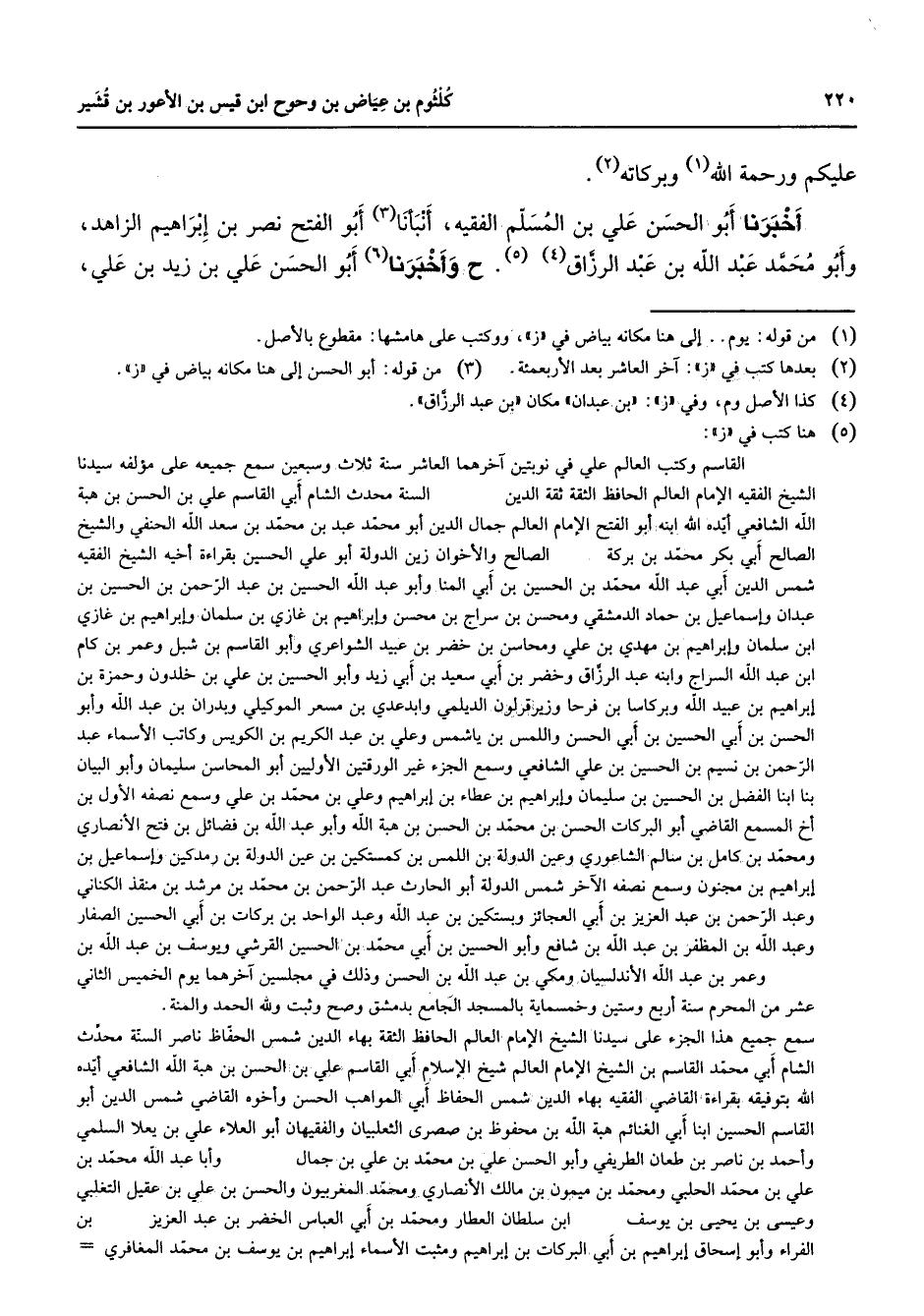 عليكم ورحمة الله (1) وبركاته (2) أخبرنا أبو الحسن علي بن المسلم الفقيه أنبأنا (3) أبو الفتح نصر بن إبراهيم الزاهد وأبو محمد عبد الله بن عبد الرزاق (4) (5) ح وأخبرنا (6) أبو الحسن علي بن زيد بن علي