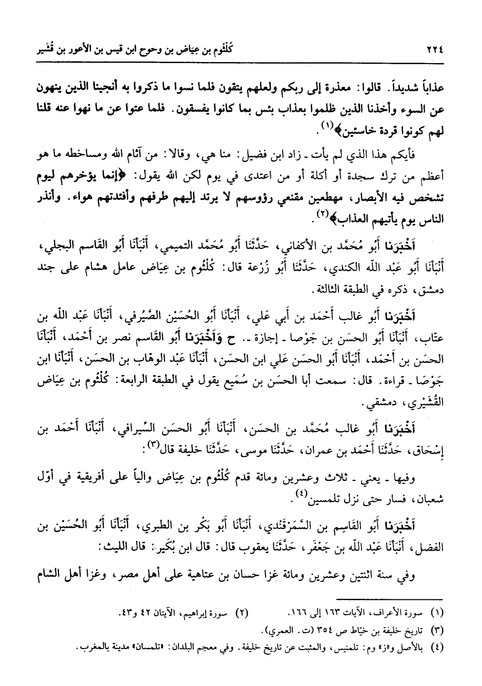 عذابا شديدا قالوا معذرة إلى ربكم ولعلهم يتقون فلما نسوا ما ذكروا به أنجينا الذين ينهون عن السوء وأخذنا الذين ظلموا بعذاب بئس بما كانوا يفسقون فلما عتوا عن ما نهوا عنه قلنا لهم كونوا قردة خاسئين " (1) فأيكم هذا الذي لم يأت زاد ابن فضيل منا هي وقالا من آثام الله ومساخطه ما هو أعظم من ترك سجدة أو أكلة أو من اعتدي في يوم لكن الله يقول " إنما يؤخرهم ليوم تشخص فيه الأبصار مهطعين مقنعي رؤوسهم لا يرتد إليهم طرفهم وأفئدتهم هواء وأنذر الناس يوم يأتيهم العذاب " (2) أخبرنا أبو محمد بن الأكفاني حدثنا أبو محمد التميمي أنبأنا أبو القاسم البجلي أنبأنا أبو عبد الله الكندي حدثنا أبو زرعة قال كلثوم بن عياض عامل هشام على جند دمشق ذكره في الطبقة الثالثة أخبرنا أبو غالب أحمد بن أبي علي أنبأنا أبو الحسين الصيرفي أنبأنا عبد الله بن عتاب أنبأنا أبو الحسن بن جوصا إجازة ح وأخبرنا أبو القاسم نصر بن أحمد أنبأنا الحسن بن أحمد أنبأنا أبو الحسن علي ابن الحسن أنبأنا عبد الوهاب بن الحسن أنبأنا ابن جوصا قراءة قال سمعت أبا الحسن بن سميع يقول في الطبقة الرابعة كلثوم بن عياض القشيري دمشقي أخبرنا أبو غالب محمد بن الحسن أنبأنا أبو الحسن السيرافي أنبأنا أحمد بن إسحاق حدثنا أحمد بن عمران حدثنا موسى حدثنا خليفة قال (3) وفيها يعني ثلاث وعشرين ومائة قدم كلثوم بن عياض واليا على أفريقية في أول شعبان فسار حتى نزل تلمسين (4) أخبرنا أبو القاسم بن السمرقندي أنبانا أبو بكر بن الطبري أنبانا أبو الحسين بن الفضل أنبأنا عبد الله بن جعفر حدثنا يعقوب قال قال ابن بكير قال الليث وفي سنة اثنتين وعشرين ومائة غزا حسان بن عتاهية على أهل مصر وغزا أهل الشام