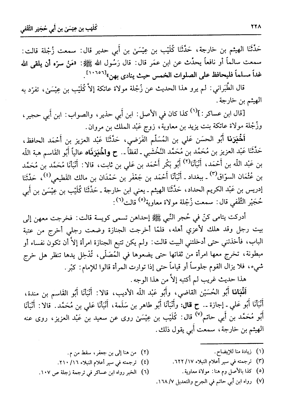 [10656] قال الطبراني لم يرو هذا الحديث عن زجلة مولاة عاتكة إلا كليب بن عيسى تفرد به الهيثم بن خارجة قال ابن عساكر (1) كذا كان في الأصل ابن أبي حذير والصواب ابن أبي حجير وزجلة مولاة عاتكة بنت يزيد بن معاوية زوج عبد الملك بن مروان أخبرنا أبو الحسن علي بن المسلم الفرضي حدثنا عبد العزيز بن أحمد الحافظ حدثنا عبد العزيز بن محمد بن محمد النخشبي لفظا ح وأخبرناه عاليا أبو القاسم هبة الله بن عبد الله بن أحمد أنبأنا (2) أبو بكر أحمد بن علي بن ثابت قالا أنبأنا محمد بن محمد بن عثمان السواق (3) ببغداد أنبأنا أحمد بن جعفر بن حمدان بن مالك القطيعي (4) حدثنا إدريس بن عبد الكريم الحداد حدثنا الهيثم يعني ابن خارجة حدثنا كليب بن عيسى بن أبي حجير الثقفي قال سمعت زجلة مولاة معاوية (5) قالت (6) أدركت يتامى كن في حجر النبي (صلى الله عليه وسلم) إحداهن تسمى كويسة قالت فخرجت معهن إلى بيت رجل وقد هلك لأعزي أهله فلما أخرجت الجنازة وضعت رجلي أخرج من عتبة الباب فأخذتني حتى أدخلتني البيت قالت ولم يكن تتبع الجنازة امرأة إلا أن تكون نفساء أو مبطونة تخرج معها امرأة من ثقاتها حتى يضعوها في المصلى تدخل يدها تنظر هل خرج شئ فلا يزال القوم جلوسا أو قياما حتى إذا توارت المرأة قالوا للإمام كبر هذا حديث غريب لم أكتبه إلا من هذا الوجه أنبأنا أبو الحسين القاضي وأبو عبد الله الأديب قالا أنبانا أبو القاسم بن مندة أنبأنا أبو علي إجازة ح قال وأنبأنا أبو طاهر بن سلمة أنبأنا علي بن محمد قالا أنبانا أبو محمد بن أبي حاتم (7) قال كليب بن عيسى روى عن سعيد بن عبد العزيز روى عنه الهيثم بن خارجة سمعت أبي يقول ذلك