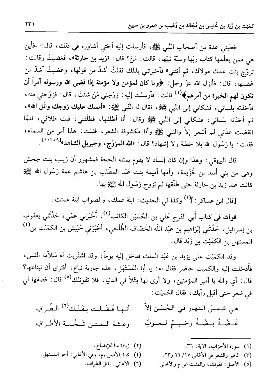 [10659] قال البيهقي وهذا وإن كان إسناد لا يقوم بمثله الحجة فمشهور أن زينب بنت جحش وهي من بني أسد بن خزيمة وأمها أميمة بنت عبد المطلب بن هاشم عمة رسول الله (صلى الله عليه وسلم) كانت عند زيد بن حارثة حتى طلقها ثم تزوج رسول الله (صلى الله عليه وسلم) بها قال ابن عساكر (2) وكذا في الحديث ابنة عمك والصواب ابنة عمتك قرأت في كتاب أبي الفرج علي بن الحسين الكاتب (3) أخبرني عمي حدثني يعقوب بن إسرائيل حدثني إبراهيم بن عبد الله الخصاف الطلحي أخبرني حبيش بن الكميت بن (4) المستهل بن الكميت بن زيد قال وفد الكميت على يزيد بن عبد الملك فدخل إليه يوما وقد اشتريت له سلامة القس فأدخلت إليه والكميت حاضر فقال له يا أبا المستهل هذه جارية تباع أفترى أن نبتاعها قال أي والله يا أمير المؤمنين ولا أرى لها مثلا في الدنيا فلا تفوتنك (5) قال فصفها لي في شعر حتى أقبل رأيك فقال الكميت: هي شمس النهار في الحسن إلا * أنها فضلت بفتك (6) الطراف غضة بضة رخيم لعوب * وعثة المتن شختة الأطراف