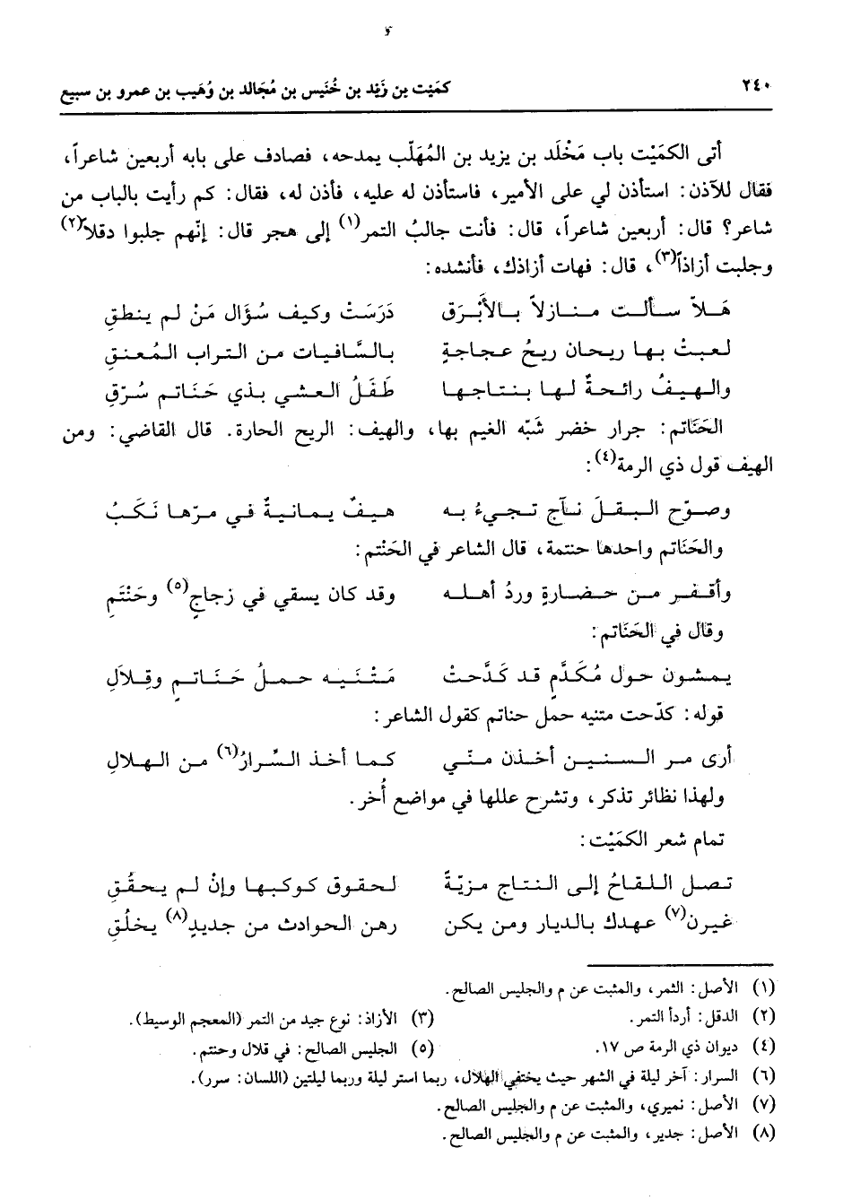 أتى الكميت باب مخلد بن يزيد بن المهلب يمدحه فصادف على بابه أربعين شاعرا فقال للآذن استأذن لي على الأمير فاستأذن له عليه فأذن له فقال كم رأيت بالباب من شاعر قال أربعين شاعرا قال فأنت جالب التمر (1) إلى هجر قال إنهم جلبوا دقلا (2) وجلبت أزاذا (3) قال فهات أزاذك فأنشده: هلا سألت منازلا بالأبرق * درست وكيف سؤال من لم ينطق لعبت بها ريحان ريح عجاجة * بالسافيات من التراب المعنق والهيف رائحة لها بنتاجها * طفل العشي بذي حناتم سرق الحناتم جرار خضر شبه الغيم بها والهيف الريح الحارة قال القاضي ومن الهيف قول ذي الرمة (4) : وصوح البقل ناج تجئ به * هيف يمانية في مرها نكب والحناتم واحدها حنتمة قال الشاعر في الحنتم: وأقفر من حضارة ورد أهله * وقد كان يسقي في زجاج (5) وحنتم وقال في الحناتم: يمشون حول مكدم قد كدحت * متنيه حمل حناتم وقلال قوله كدحت متيه حمل حناتم كقول الشاعر: أرى مر السنين أخذن مني * كما أخذ السرار (6) من الهلال ولهذا نظائر تذكر وتشرح عللها في مواضع أخر تمام شعر الكميت: تصل اللقاح إلى النتاج مزية * لحقوق كوكبها وإن لم يحقق غيرن (7) عهدك بالديار ومن يكن * رهن الحوادث من جديد (8) يخلق