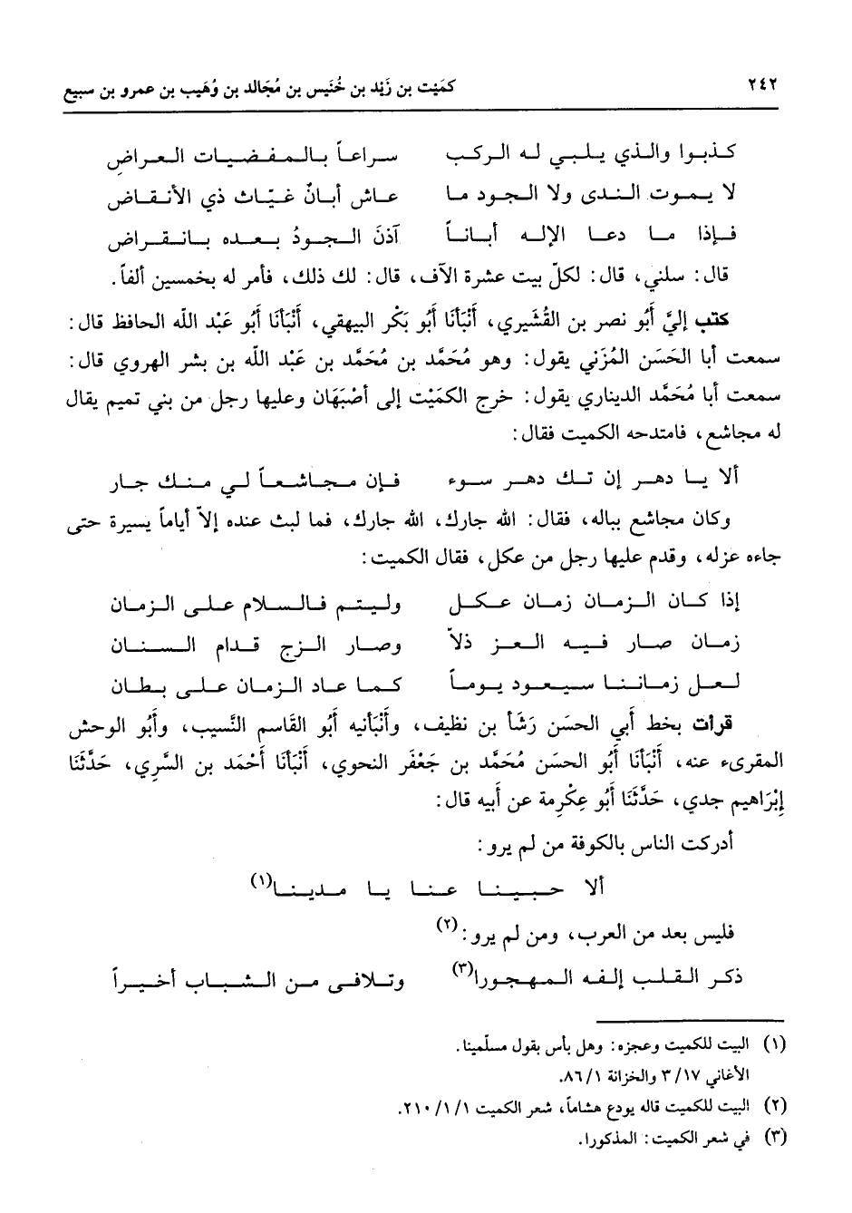 كذبوا والذي يلبي له الركب * سراعا بالمفضيات العراض لا يموت الندى ولا الجود ما * عاش أبان غياث ذي الأنقاض فإذا ما دعا الإله أبانا * آذن الجود بعده بانقراض قال سلني قال لكل بيت عشرة آلاف قال لك ذلك فأمر له بخمسين ألفا كتب إلي أبو نصر بن القشيري أنبأنا أبو بكر البيهقي أنبأنا أبو عبد الله الحافظ قال سمعت أبا الحسن المزني يقول وهو محمد بن محمد بن عبد الله بن بشر الهروي قال سمعت أبا محمد الديناري يقول خرج الكميت إلى أصبهان وعليها رجل من بني تميم يقال له مجاشع فامتدحه الكميت فقال: ألا يا دهر إن تك دهر سوء * فإن مجاشعا لي منك جار وكان مجاشع بباله فقال الله جارك الله جارك فما لبث عنده إلا أياما يسيرة حتى جاءه عزله وقدم عليها رجل من عكل فقال الكميت: إذا كان الزمان زمان عكل * وليتم فالسلام على الزمان زمان صار فيه العز ذلا * وصار الزج قدام السنان لعل زماننا سيعود يوما * كما عاد الزمان على بطان قرأت بخط أبي الحسن رشأ بن نظيف وأنبأنيه أبو القاسم النسيب وأبو الوحش المقرئ عنه أنبأنا أبو الحسن محمد بن جعفر النحوي أنبأنا أحمد بن السري حدثنا إبراهيم جدي حدثنا أبو عكرمة عن أبيه قال أدركت الناس بالكوفة من لم يرو: إلا حبينا عنا يا مدينا (1) فليس بعد من العرب ومن لم يرو (2) : ذكر القلب ألفه المهجورا (3) * وتلافي من الشباب أخيرا