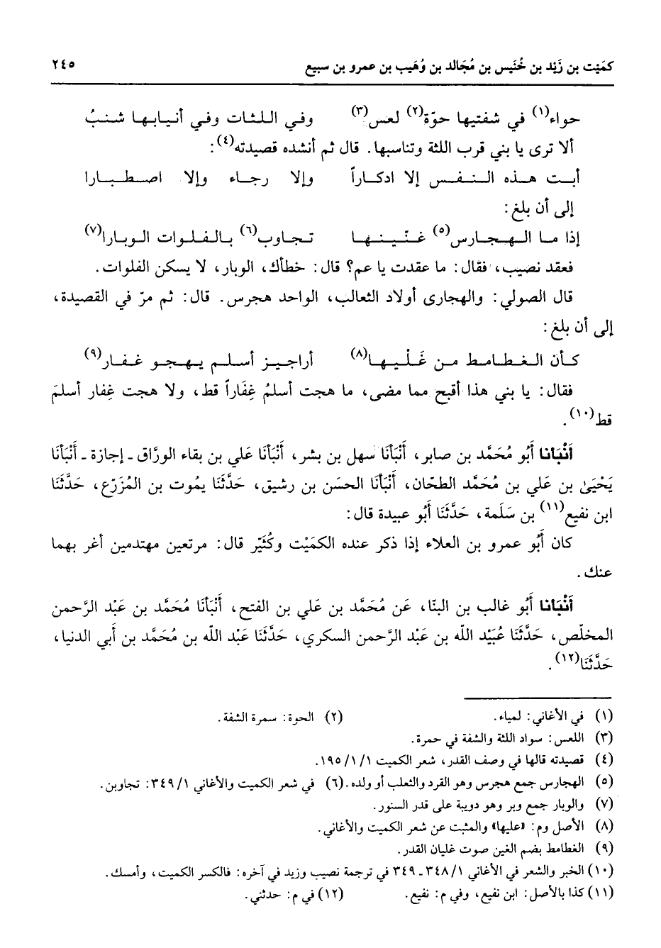 حواء (1) في شفتيها حوة (2) لعس (3) * وفي اللثات وفي أنيابها شنب الا ترى يا بني قرب اللثة وتناسبها قال ثم أنشده قصيدته (4) : أبت هذه النفس إلا إدكارا * وإلا رجاء وإلا اصطبارا إلى أن بلغ: إذا ما الهجارس (5) غنينها * تجاوب (6) بالفلوات الوبارا (7) فعقد نصيب فقال ما عقدت يا عم قال خطأك الوبار لا يسكن الفلوات قال الصولي والهجاري أولاد الثعالب الواحد هجرس قال ثم مر في القصيدة إلى أن بلغ: كأن الغطامط من غليها (8) * أراجيز أسلم يهجو غفار (9) فقال يا بني هذا أقبح مما مضى ما هجت أسلم غفارا قط ولا هجت غفار أسلم قط (10) أنبأنا أبو محمد بن صابر أنبأنا سهل بن بشر أنبأنا علي بن بقاء الوراق إجازة أنبأنا يحيى بن علي بن محمد الطحان أنبأنا الحسن بن رشيق حدثنا يموت بن المزرع حدثنا ابن نفيع (11) بن سلمة حدثنا أبو عبيدة قال كان أبو عمرو بن العلاء إذا ذكر عنده الكميت وكثير قال مرتعين مهتدمين أغر بهما عنك أنبأنا أبو غالب بن البنا عن محمد بن علي بن الفتح أنبأنا محمد بن عبد الرحمن المخلص حدثنا عبيد الله بن عبد الرحمن السكري حدثنا عبد الله بن محمد بن أبي الدنيا حدثنا (12)