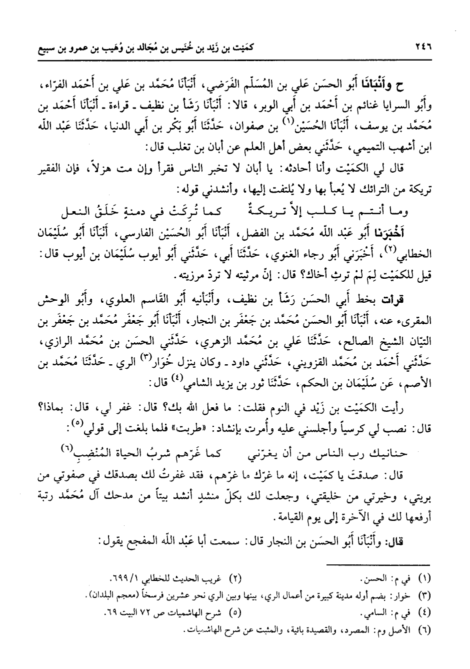 ح وأنبأنا أبو الحسن علي بن المسلم الفرضي أنبأنا محمد بن علي بن أحمد الفراء وأبو السرايا غنائم بن أحمد بن أبي الوبر قالا أنبأنا رشأ بن نظيف قراءة أنبأنا أحمد بن محمد بن يوسف أنبأنا الحسين (1) بن صفوان حدثنا أبو بكر بن أبي الدنيا حدثنا عبد الله ابن أشهب التميمي حدثني بعض أهل العلم عن أبان بن تغلب قال قال لي الكميت وأنا أحادثه يا ابان لا تخبر الناس فقرأ وإن مت هزلا فإن الفقير تريكة من الترائك لا يعبأ بها ولا يلتفت إليها وأنشدني قوله: وما أنتم يا كلب إلا تريكة * كما تركت في دمنة خلق النعل أخبرنا أبو عبد الله محمد بن الفضل أنبأنا أبو الحسين الفارسي أنبأنا أبو سليمان الخطابي (2) أخبرني أبو رجاء الغنوي حدثنا أبي حدثني أبو أيوب سليمان بن أيوب قال قيل للكميت لم لم ترث أخاك قال إن مرثيته لا ترد مرزيته قرأت بخط أبي الحسن رشأ بن نظيف وأنبأنيه أبو القاسم العلوي وأبو الوحش المقرئ عنه أنبأنا أبو الحسن محمد بن جعفر بن النجار أنبأنا أبو جعفر محمد بن جعفر بن التيان الشيخ الصالح حدثنا علي بن محمد الزهري حدثني الحسن بن محمد الرازي حدثني أحمد بن محمد القزويني حدثني داود وكان ينزل خوار (3) الري حدثنا محمد بن الأصم عن سليمان بن الحكم حدثنا نور بن يزيد الشامي (4) قال: رأيت الكميت بن زيد في النوم فقلت ما فعل الله بك قال غفر لي قال بماذا قال نصب لي كرسيا وأجلسني عليه وأمرت بإنشاد طربت فلما بلغت إلى قولي (5) حنانيك رب الناس من أن يغرني * كما غرهم شرب الحياة المنضب (6) قال صدقت يا كميت إنه ما غرك ما غرهم فقد غفرت لك بصدقك في صفوتي من بريتي وخيرتي من خليقتي وجعلت لك بكل منشد أنشد بيتا من مدحك آل محمد رتبة أرفعها لك في الآخرة إلى يوم القيامة قال وأنبأنا أبو الحسن بن النجار قال سمعت أبا عبد الله المفجع يقول