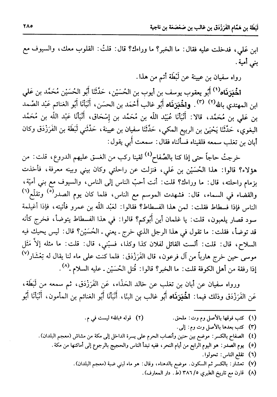 ابن علي فدخلت عليه فقال ما الخبر ما وراءك قال قلت القلوب معك والسيوف مع بني أمية رواه سفيان بن عيينة عن لبطة أتم من هذا أخبرناه أبو يعقوب يوسف بن أيوب بن الحسين حدثنا أبو الحسين محمد بن علي ابن المهتدي بالله (2) (3) وأخبرناه أبو غالب أحمد بن الحسن أنبأنا أبو الغنائم عبد الصمد بن علي بن محمد قالا أنبأنا عبيد الله بن محمد بن إسحاق أنبأنا عبد الله بن محمد البغوي حدثنا يحيى بن الربيع المكي حدثنا سفيان بن عيينة حدثني لبطة بن الفرزدق وكان أبان بن تغلب سمعه فلقيناه فسألناه فقال سمعت أبي يقول خرجت حاجا حتى إذا كنا بالصفاح (4) لقينا ركب من الغسق عليهم الدروع قلت من هؤلاء قالوا هذا الحسين بن علي فنزلت عن راحلتي وكان بيني وبينه معرفة فأخذت بزمام راحلته قال ما وراءك قلت أنت أحب الناس إلى الناس والسيوف مع بني أمية والقضاء في السماء قال فشهدت الموسم مع الناس فلما كان يوم الصدر (5) وتقلع (6) الناس فإذا فسطاط فقلت لمن هذا الفسطاط فقالوا لعبد الله بن عمرو فأتيته فإذا أغيلمة سود قصار يلعبون قلت يا غلمان أين أبوكم قالوا في هذا الفسطاط يتوضأ فخرج كأنه قد توضأ فقلت ما تقول في هذا الرجل الذي خرج يعني الحسين قال ليس يحيك فيه السلاح قال قلت ألست القائل لفلان كذا وكذا فسبني قال قلت ما مثله إلا مثل موسى حين خرج هاربا من آل فرعون قال الفرزدق فلما كنت على ماء لنا يقال له تعشار (7) إذا رفقة من أهل الكوفة قلت ما الخبر قالوا قتل الحسين عليه السلام (8) ورواه سفيان عن أبان بن تغلب عن خالد الحذاء عن الفرزدق ثم سمعه من لبطة عن الفرزدق وذلك فيما أخبرناه أبو غالب بن البنا أنبأنا أبو الغنائم بن المأمون أنبأنا أبو