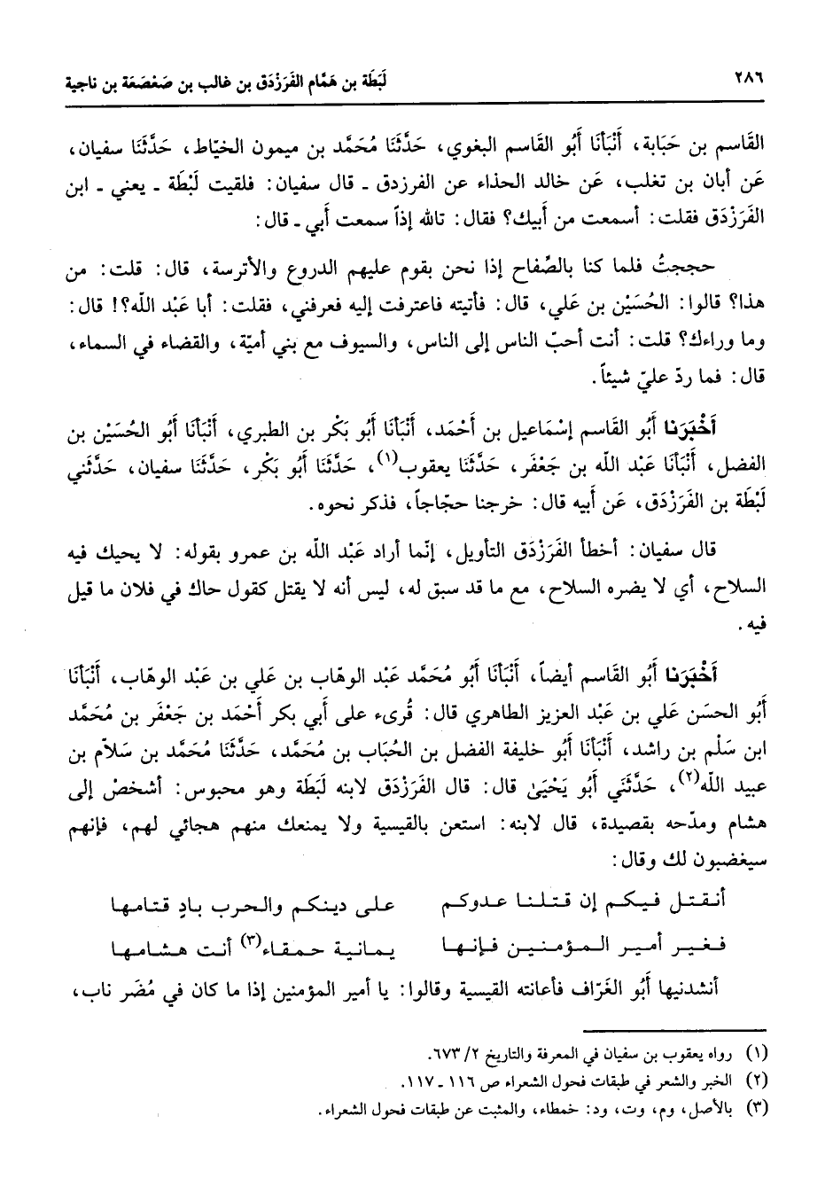 القاسم بن حبابة أنبأنا أبو القاسم البغوي حدثنا محمد بن ميمون الخياط حدثنا سفيان عن أبان بن تغلب عن خالد الحذاء عن الفرزدق قال سفيان فلقيت لبطة يعني ابن الفرزدق فقلت أسمعت من أبيك فقال تالله إذا سمعت أبي قال حججت فلما كنا بالصفاح إذا نحن بقوم عليهم الدروع والأترسة قال قلت من هذا قالوا الحسين بن علي قال فأتيته فاعترفت إليه فعرفني فقلت أبا عبد الله قال وما وراءك قلت أنت أحب الناس إلى الناس والسيوف مع بني أمية والقضاء في السماء قال فما رد علي شيئا أخبرنا أبو القاسم إسماعيل بن أحمد أنبأنا أبو بكر بن الطبري أنبأنا أبو الحسين بن الفضل أنبأنا عبد الله بن جعفر حدثنا يعقوب (1) حدثنا أبو بكر حدثنا سفيان حدثني لبطة بن الفرزدق عن أبيه قال خرجنا حجاجا فذكر نحوه قال سفيان أخطأ الفرزدق التأويل إنما أراد عبد الله بن عمرو بقوله لا يحيك فيه السلاح أي لا يضره السلاح مع ما قد سبق له ليس أنه لا يقتل كقول حاك في فلان ما قيل فيه أخبرنا أبو القاسم أيضا أنبأنا أبو محمد عبد الوهاب بن علي بن عبد الوهاب أنبأنا أبو الحسن علي بن عبد العزيز الطاهري قال قرئ على أبي بكر أحمد بن جعفر بن محمد ابن سلم بن راشد أنبأنا أبو خليفة الفضل بن الحباب بن محمد حدثنا محمد بن سلام بن عبيد الله (2) حدثني أبو يحيى قال قال الفرزدق لابنه لبطة وهو محبوس أشخص إلى هشام ومدحه بقصيدة قال لابنه استعن بالقيسية ولا يمنعك منهم هجائي لهم فإنهم سيغضبون لك وقال: أنقتل فيكم إن قتلنا عدوكم * على دينكم والحرب باد قتامها فغير أمير المؤمنين فإنها * يمانية حمقاء أنت هشامها أنشدنيها أبو الغراف فأعانته القيسية وقالوا يا أمير المؤمنين إذا ما كان في مضر ناب