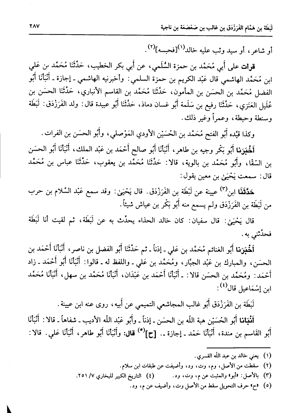 أبو شاعر أو سيد وثب عليه خالد (1) فحسبه (2) قرأت على أبي محمد بن حمزة السلمي عن أبي بكر الخطيب حدثنا محمد بن علي ابن محمد الهاشمي قال عبد الكريم بن حمزة السلمي وأخبرنيه الهاشمي إجازة أنبأنا أبو الفضل محمد بن الحسن بن المأمون حدثنا محمد بن القاسم الأنباري حدثنا الحسن بن عليل العنزي حدثنا رفيع بن سلمة أبو غسان دماذ حدثنا أبو عبيدة قال ولد الفرزدق لبطة وسنطة وحبطة وعمرا وغير ذلك وكذا قيده أبو الفتح محمد بن الحسين الأودي الموصلي وأبو الحسن بن الفرات أخبرنا أبو بكر وجيه بن طاهر أنبأنا أبو صالح أحمد بن عبد الملك أنبأنا أبو الحسن بن السقا وأبو حمد بن بالوية قالا حدثنا محمد بن يعقوب حدثنا عباس بن محمد قال سمعت يحيى بن معين يقول حدثنا ابن (3) عيينة عن لبطة بن الفرزدق قال يحيى وقد سمع عبد السلام بن حرب من لبطة بن الفرزدق ولم يسمع منه أبو بكر بن عياش شيئا قال يحيى قال سفيان كان خالد الحذاء يحدث به عن لبطة ثم لقيت أنا لبطة فحدثني به أخبرنا أبو الغنائم محمد بن علي إذنا ثم حدثنا أبو الفضل بن ناصر أنبأنا أحمد بن الحسن والمبارك بن عبد الجبار ومحمد بن علي واللفظ له قالوا أنبأنا أبو أحمد زاد أحمد ومحمد بن الحسن قالا أنبأنا أحمد بن عبدان أنبأنا محمد بن سهل أنبأنا محمد بن إسماعيل قال (4) لبطة بن الفرزدق أبو غالب المجاشعي التميمي عن أبيه روى عنه ابن عيينة أنبأنا أبو الحسين هبة الله بن الحسن إذنا وأبو عبد الله الأديب شفاها قالا أنبأنا أبو القاسم بن مندة أنبأنا حمد إجازة -[ح] (5) قال وأنبأنا أبو طاهر أنبأنا علي قالا