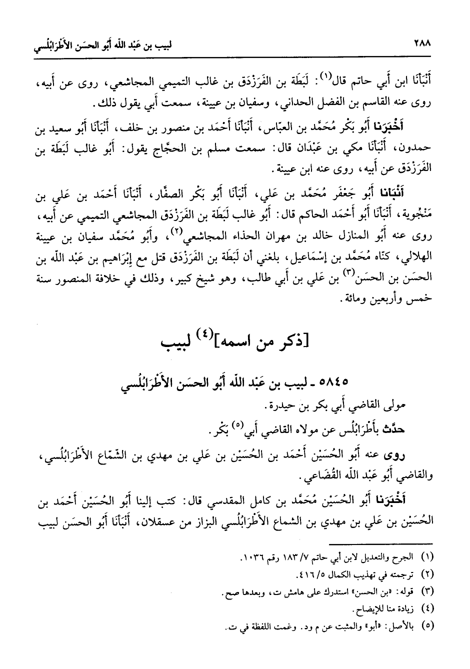أنبأنا ابن أبي حاتم قال (1) لبطة بن الفرزدق بن غالب التميمي المجاشعي روى عن أبيه روى عنه القاسم بن الفضل الحداني وسفيان بن عيينة سمعت أبي يقول ذلك أخبرنا أبو بكر محمد بن العباس أنبأنا أحمد بن منصور بن خلف أنبأنا أبو سعيد بن حمدون أنبأنا مكي بن عبدان قال سمعت مسلم بن الحجاج يقول أبو غالب لبطة بن الفرزدق عن أبيه روى عنه ابن عيينة أنبأنا أبو جعفر محمد بن علي أنبأنا أبو بكر الصفار أنبأنا أحمد بن علي بن منجوية أنبأنا أبو أحمد الحاكم قال أبو غالب لبطة بن الفرزدق المجاشعي التميمي عن أبيه روى عنه أبو المنازل خالد بن مهران الحذاء المجاشعي وأبو محمد سفيان بن عيينة الهلالي كناه محمد بن إسماعيل بلغني أن لبطة بن الفرزدق قتل مع إبراهيم بن عبد الله بن الحسن بن الحسن (3) بن علي بن أبي طالب وهو شيخ كبير وذلك في خلافة المنصور سنة خمس وأربعين ومائة " ذكر من اسمه (4) لبيب " 5845 - لبيب بن عبد الله أبو الحسن الأطرابلسي مولى القاضي أبي بكر بن حيدرة حدث بأطرابلس من مولاه القاضي أبي (5) بكر روى عنه أبو الحسين أحمد بن الحسين بن علي بن مهدي بن الشماع الأطرابلسي والقاضي أبو عبد الله القضاعي أخبرنا أبو الحسين محمد بن كامل المقدسي قال كتب إلينا أبو الحسين أحمد بن الحسين بن علي بن مهدي بن الشماع الأطرابلسي البزاز من عسقلان أنبأنا أبو الحسن لبيب