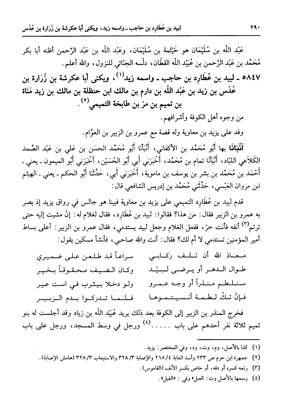 5847 - لبيد بن عطارد بن حاجب واسمه زيد (1) ويكنى أبا عكرشة بن زرارة بن عدس بن زيد بن عبد الله بن دارم بن مالك ابن حنظلة بن مالك بن زيد مناة بن تميم بن مر بن طابخة التميمي (2) من وجوه أهل الكوفة وأشرافهم وفد على يزيد بن معاوية وله قصة مع عمرو بن الزبير بن العوام أنبأنا بها أبو محمد بن الأكفاني أنبأنا أبو محمد الحسن بن علي بن عبد الصمد الكلاعي اللباد أنبأنا تمام بن محمد أخبرني أبي أبو الحسين أخبرني أبو الميمون يعني أحمد بن محمد بن بشر بن يوسف بن ماموية أخبرني أبي حدثنا أبو الحكم يعني الهيثم ابن مروان العبسي حدثني محمد بن إدريس الشافعي قال قدم لبيد بن عطار التميمي على يزيد بن معاوية فبينا هو جالس في رواق يزيد إذ بصر به عمرو بن الزبير فقال من هذا فقالوا لبيد بن عطارد فقال لغلام له إن مشيت إليه حتى ترتم (3) أنفه فأنت حر ففعل الغلام وجعل لبيد يستدمي فقال عمرو بن الزبير أعلى بساط أمير المؤمنين تستدمي لا أم لك فقال أنت والله صاحبي فأنشأ مسكين يقول: معاذ الله أن تلف ركابي * سراعا قد طلعن على ضميري طوال الدهر أو يرضى لبيد * وكان الضيف محقوقا بخير سنلطم منذرا أو وجه عمرو * ولو دخلا بيثرب في است عير فإن تك لطمة أنسيتموها * فلما تدركوا بدم الزبير فخرج المنذر بن الزبير إلى الكوفة بعد ذلك يريد عبيد الله بن زياد وقد أجلست له بنو تميم ثلاثة نفر أحدهم على باب
