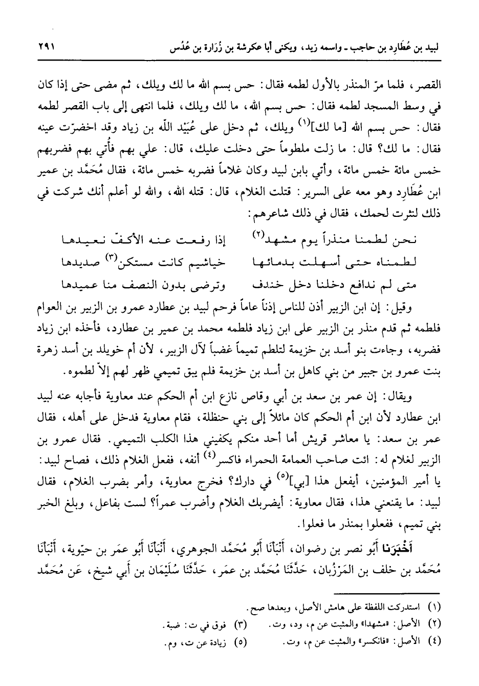 القصر فلما مر المنذر بالأول لطمه فقال حس بسم الله ما لك ويلك ثم مضى حتى إذا كان في وسط المسجد لطمه فقال حس بسم الله ما لك ويلك فلما انتهى إلى باب القصر لطمه فقال حس بسم الله ما لك (1) ويلك ثم دخل على عبيد الله بن زياد وقد اخضرت عينه فقال ما لك قال ما زلت ملطوما حتى دخلت عليك قال علي بهم فأتي بهم فضربهم خمس مائة خمس مائة وأتي بابن لبيد وكان غلاما فضربه خمس مائة فقال محمد بن عمير ابن عطارد وهو معه على السرير قتلت الغلام قال قتله الله والله لو أعلم أنك شركت في ذلك لنثرت لحمك فقال في ذلك شاعرهم: نحن لطمنا منذرا يوم مشهد (2) * إذا رفعت عنه الأكف نعيدها لطمناه حتى أسهلت بدمائها * خياشيم كانت مستكن (3) صديدها متى لم ندافع دخلنا دخل خندف * وترضى بدون النصف منا عميدها وقيل إن ابن الزبير أذن للناس إذنا عاما فرحم لبيد بن عطارد عمرو بن الوبير بن العوام فلطمه ثم قدم منذر بن الزبير على ابن زياد فلطمه محمد بن عمير بن عطارد فأخذه ابن زياد فضربه وجاءت بنو أسد بن خزيمة لتلطم تميما غضبا لآل الزبير لأن أم خويلد بن أسد زهرة بنت عمرو بن جبيل من بني كاهل بن أسد بن خزيمة فلم يبق تميمي ظهر لهم إلا لطموه ويقال إن عمرو بن سعد بن أبي وقاص نازع ابن أم الحكم عند معاوية فأجابه عنه لبيد ابن عطارد لأن ابن أم الحكم كان مائلا إلى بني حنظلة فقام معاوية فدخل على أهله فقال عمر بن سعد يا معاشر قريش أما أحد منكم يكفيني هذا الكلب التميمي فقال عمرو بن الزبير لغلام له ائت صاحب العمامة الحمراء فاكسر (4) أنفه ففعل الغلام ذلك فصاح لبيد يا أمير المؤمنين أيفعل هذا بي (5) في دارك فخرج معاوية وأمر بضرب الغلام فقال لبيد ما يقنعني هذا فقال معاوية أيضربك الغلام وأضرب عمرا لست بفاعل وبلغ الخبر بني تميم ففعلوا بمنذر ما فعلوا أخبرنا أبو نصر بن رضوان أنبأنا أبو محمد الجوهري أنبأنا أبو عمر بن حيوية أنبأنا محمد بن خلف المرزبان حدثنا محمد بن عمر حدثنا سليمان بن أبي شيخ عن محمد