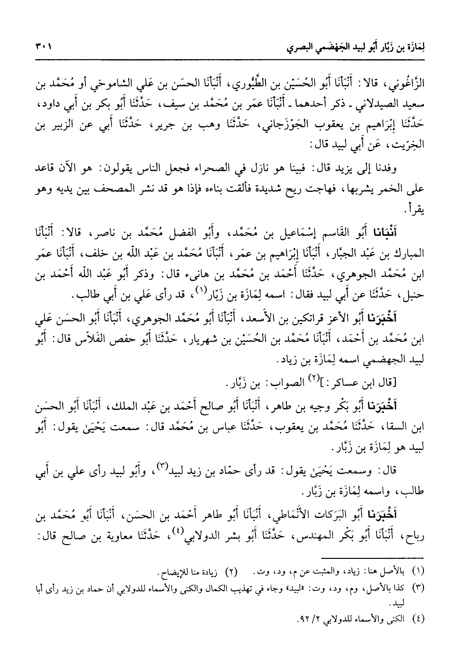 الزاغوني قالا أنبانا أبو الحسين بن الطيوري أنبأنا الحسن بن علي الشاموخي أو محمد بن سعيد الصيدلاني ذكر أحدهما أنبانا عمر بن محمد بن سيف حدثنا أبو بكر بن أبي داود حدثنا إبراهيم بن يعقوب الجوزجاني حدثنا وهب بن جرير حدثنا أبي عن الزبير بن الخريت عن أبي لبيد قال وفدنا إلى يزيد قال فبينا هو نازل في الصحراء فجعل الناس يقولون هو الآن قاعد على الخمر يشربها فهاجت ريح شديدة فألقت بناءه فإذا هو قد نشر المصحف بين يديه وهو يقرأ أنبأنا أبو القاسم إسماعيل بن محمد وأبو الفضل محمد بن ناصر قالا أنبانا المبارك بن عبد الجبار أنبأنا إبراهيم بن عمر أنبأنا محمد بن عبد الله بن خلف أنبأنا عمر ابن محمد الجوهري حدثنا أحمد بن محمد بن هانئ قال وذكر أبو عبد الله أحمد بن حنبل حدثنا عن أبي لبيد فقال اسمه لمازة بن زبار (1) قد رأى علي بن أبي طالب أخبرنا أبو الأعز قراتكين بن الأسعد أنبأنا أبو محمد الجوهري أنبأنا أبو الحسن علي ابن محمد بن أحمد أنبأنا محمد بن الحسين بن شهريار حدثنا أبو حفص الفلاس قال أبو لبيد الجهضمي اسمه لمازة بن زياد قال ابن عساكر (2) الصواب بن زبار أخبرنا أبو بكر وجيه بن طاهر أنبأنا أبو صالح أحمد بن عبد الملك أنبأنا أبو الحسن ابن السقا حدثنا محمد بن يعقوب حدثنا عباس بن محمد قال سمعت يحيى يقول أبو لبيد هو لمازة بن زبار قال وسمعت يحيى يقول قد رأى حماد بن زيد لبيد (3) وأبو لبيد رأى علي بن أبي طالب واسمه لمازة بن زبار أخبرنا أبو البركات الأنماطي أنبأنا أبو طاهر أحمد بن الحسن أنبأنا أبو محمد بن رباح أنبانا أبو بكر المهندس حدثنا أبو بشر الدولابي (4) حدثنا معاوية بن صالح قال
