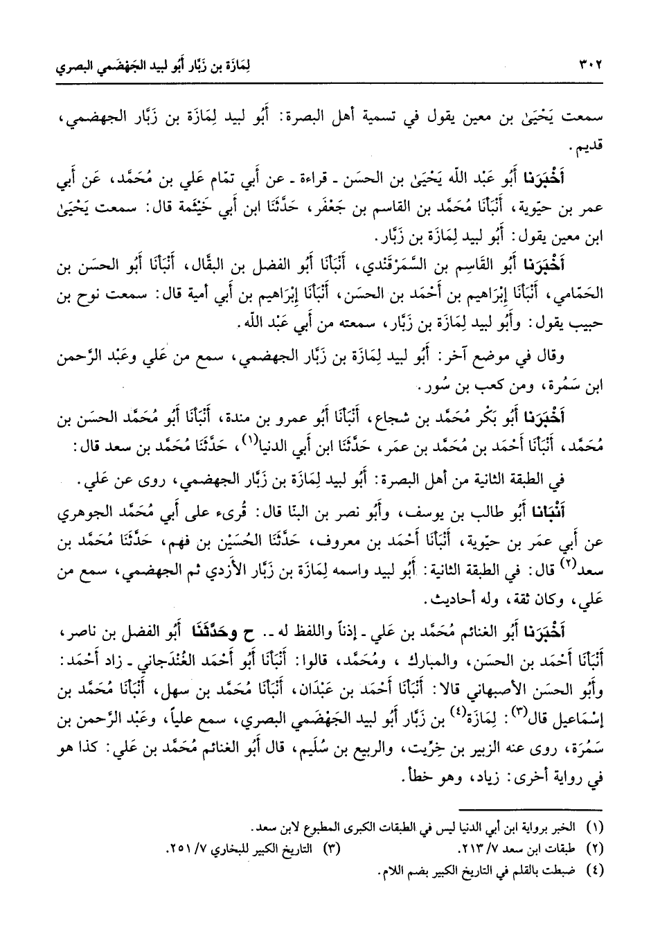 سمعت يحيى بن معين يقول في تسمية أهل البصرة أبو لبيد لمازة بن زبار الجهضمي قديم أخبرنا أبو عبد الله يحيى بن الحسن قراءة عن أبي تمام علي بن محمد عن أبي عمر بن حيوية أنبأنا محمد بن القاسم بن جعفر حدثنا ابن أبي خيثمة قال سمعت يحيى ابن معين يقول أبو لبيد لمازة بن زبار أخبرنا أبو القاسم بن السمرقندي أنبأنا أبو الفضل بن البقال أنبأنا أبو الحسن بن الحمامي أنبأنا إبراهيم بن أحمد بن الحسن أنبأنا إبراهيم بن أبي أمية قال سمعت نوح بن حبيب يقول وأبو لبيد لمازة بن زبار سمعته من أبي عبد الله وقال في موضع آخر أبو لبيد لمازة بن زيار الجهضمي سمع من علي وعبد الرحمن ابن سمرة ومن كعب بن سور أخبرنا أبو بكر محمد بن شجاع أنبأنا أبو عمرو بن مندة أنبأنا أبو محمد الحسن بن محمد أنبأنا أحمد بن محمد بن عمر حدثنا ابن أبي الدنيا (1) حدثنا محمد بن سعد قال في الطبقة الثانية من أهل البصرة أبو لبيد لمازة بن زبار الجهضمي روى عن علي أنبأنا أبو طالب بن يوسف وابو نصر بن البنا قال قرئ على أبي محمد الجوهري عن أبي عمر بن حيوية أنبأنا أحمد بن معروف حدثنا الحسين بن فهم حدثنا محمد بن سعد (2) قال في الطبقة الثانية أبو لبيد واسمه لمازة بن زبار الأزدي ثم الجهضمي سمع من علي وكان ثقة وله أحاديث أخبرنا أبو الغنائم محمد بن علي إذنا واللفظ له ح وحدثنا أبو الفضل بن ناصر أنبأنا أحمد بن الحسن والمبارك ومحمد قالوا أنبأنا أبو أحمد الغندجاني زاد أحمد وأبو الحسن الأصبهاني قالا أنبأنا أحمد بن عبدان أنبأنا محمد بن سهل أنبأنا محمد بن إسماعيل قال (3) لمازة (4) بن زبار أبو لبيد الجهضمي البصري سمع عليا وعبد الرحمن بن سمرة روى عنه الزبير بن خريت والربيع بن سليم قال أبو الغنائم محمد بن علي كذا هو في رواية أخرى زياد وهو خطأ