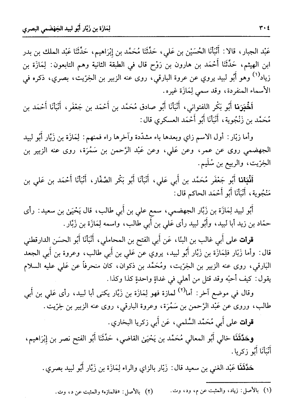 عبد الجبار قالا أنبأنا الحسين بن علي حدثنا محمد بن إبراهيم حدثنا عبد الملك بن بدر بن الهيثم حدثنا أحمد بن هارون بن روح قال في الطبقة الثانية وهم التابعون لمازة بن زياد (1) وهو أبو لبيد يروي عن عروة البارقي روى عنه الزبير بن الخريت بصري ذكره في الأسماء المنفردة وقد سمي لمازة غيره أخبرنا أبو بكر اللفتواني أنبأنا أبو صادق محمد بن أحمد بن جعفر أنبأنا أحمد بن محمد بن زنجوية أنبأنا أبو أحمد العسكري قال وأما زبار أول الاسم زاي وبعدها باء مشددة وآخرها راء فمنهم لمازة بن زبار أبو لبيد الجهضمي روى عن عمر وعن علي وعن عبد الرحمن بن سمرة روى عنه الزبير بن الخريت والربيع بن سليم أنبأنا أبو جعفر محمد بن أبي علي أنبأنا أبو بكر الصفار أنبأنا أحمد بن علي بن منجوية أنبأنا أبو أحمد الحاكم قال أبو لبيد لمازة بن زبار الجهضني سمع علي بن أبي طالب قال يحيى بن سعيد رأى حماد بن زيد أبا لبيد وأبو لبيد رأى علي بن أبي طالب واسمه لمازة بن زبار قرأت على أبي غالب بن البنا عن أبي الفتح بن المحاملي أنبأنا أبو الحسن الدارقطني قال وأما زبار فلمازة بن زبار أبو لبيد يروي عن علي بن أبي طالب وعروة بن أبي الجعد البارقي روى عنه الزبير بن الخريت ومحمد بن ذكوان كان منحرفا عن علي عليه السلام يقول كيف أحبه وقد قتل من أهلي في غداة واحدة كذا وكذا وقال في موضع آخر أما (2) لمازة فهو لمازة بن زبار يكنى أبا لبيد رأى علي بن أبي طالب وروى عن عبد الرحمن بن سمرة وعروة البارقي روى عنه الزبير بن خريت قرأت على أبي محمد السلمي عن أبي زكريا البخاري وحدثنا خالي أبو المعالي محمد بن يحيى القاضي حدثنا أبو الفتح نصر بن إبراهيم أنبأنا أبو زكريا حدثنا عبد الغني بن سعيد قال زبار بالزاي والراء لمازة بن زبار أبو لبيد بصري