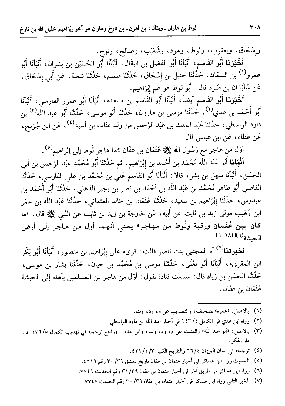 وإسحاق ويعقوب ولوط وهود وشعيب وصالح ونوح أخبرنا أبو القاسم أنبأنا أبو الفضل بن البقال أنبأنا أبو الحسين بن بشران أنبأنا أبو عمرو (1) بن السماك حدثنا حنبل بن إسحاق حدثنا مسلم حدثنا شعبة عن أبي إسحاق عن سليمان بن صرد قال أبو لوط هو عم إبراهيم أخبرنا أبو القاسم أيضا أنبأنا أبو القاسم بن مسعدة أنبأنا أبو عمرو الفارسي أنبأنا أبو أحمد بن عدي (2) حدثنا موسى بن هارون حدثنا أبو موسى حدثنا أبو عبد الله (3) بن داود الواسطي حدثنا عبد الملك بن عبد الرحمن من ولد عتاب بن أسيد (4) عن ابن جريج عن عطاء عن ابن عباس قال أول من هاجر مع رسول الله (صلى الله عليه وسلم) عثمان بن عفان كما هاجر لوط إلى إبراهيم (5) أنبأنا أبو عبد الله محمد بن أحمد بن إبراهيم ثم حدثنا أبو محمد عبد الرحمن بن أبي الحسن أنبأنا سهل بن بشر قالا أنبأنا أبو القاسم علي بن محمد بن علي الفارسي حدثنا القاضي أبو طاهر محمد بن عبد الله بن أحمد بن نصر بن بجير الذهلي حدثنا أبو أحمد بن عبدوس حدثنا إبراهيم بن سعيد حدثنا عثمان بن خالد العثماني حدثنا عبد الله بن عمر ابن وهيب مولى زيد بن ثابت عن أبيه عن خارجة بن زيد بن ثابت عن النبي (صلى الله عليه وسلم) قال ما كان بين عثمان ورقية ولوط من مهاجر يعني أنهما أول من هاجر إلى أرض الحبشة (6)