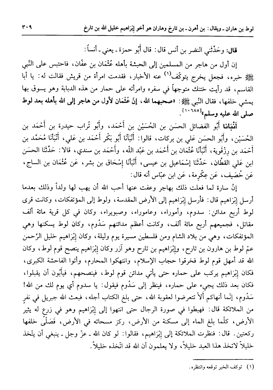 [10685] أنبأنا أبو الفضائل الحسن بن الحسين بن أحمد وأبو تراب حيدرة بن أحمد بن الحسين وأبو الحسن علي بن بركات قالوا أنبأنا أحمد بن علي أنبأنا محمد بن أحمد بن رزقوية أنبأنا عثمان بن أحمد بن عبد الله وأحمد بن سندي قالا حدثنا الحسن ابن علي القطان حدثنا إسماعيل بن عيسى أنبأنا إسحاق بن بشر عن عثمان بن الساج عن خصيف عن عكرمة عن ابن عباس أنه قال إن سارة لما فعلت ذلك بهاجر وعفت عنها أحب الله أن يهب لها ولدا وذلك بعدما أرسل إبراهيم قال فأرسل إبراهيم إلى الأرض المقدسة ولوط إلى المؤتفكات وكانت قرى لوط أربع مدائن سدوم وأموراء عاموراء وصبويراء وكان في كل قرية مائة ألف مقاتل فجميعهم أربع مائة ألف وكانت أعظم مدائنهم سدوم وكان لوط يسكنها وهي المؤتفكات وهي من بلاد الشام ومن فلسطين مسيرة يوم وليلة وكان إبراهيم خليل الرحمن عم لوط بن هارون بن تارح وإبراهيم بن تارح وهو آزر وكان إبراهيم ينصح قوم لوط وكان الله قد أمهل قوم لوط فخرقوا حجاب الإسلام وانتهكوا المحارم وأتا الفاحشة الكبرى فكان إبراهيم يركب على حماره حتى يأتي مدائن قوم لوط فينصحهم فيأبون أن يقبلوا فكان بعد ذلك يجئ على حماره فينظر إلى سدوم فيقول يا سدوم أي يوم لك من الله سدوم إنما أنهاكم ألا تتعرضوا لعقوبة الله حتى بلغ الكتاب أجله فبعث الله جبريل في نفر من الملائكة قال فهبطوا في صورة الرجال حتى انتهوا إلى إبراهيم وهو في زرع له يثير الأرض كلما بلغ الماء إلأى مسكنة من الأرض ركز مسحاته في الأرض فصلى خلفها ركعتين قال فنظرت الملائكة إلى إبراهيم فقالوا لو كان الله عز وجل ينبغي أن يتخذ خليلا لاتخذ هذا العبد خليلا ولا يعلمون أن الله قد اتخذه خليلا