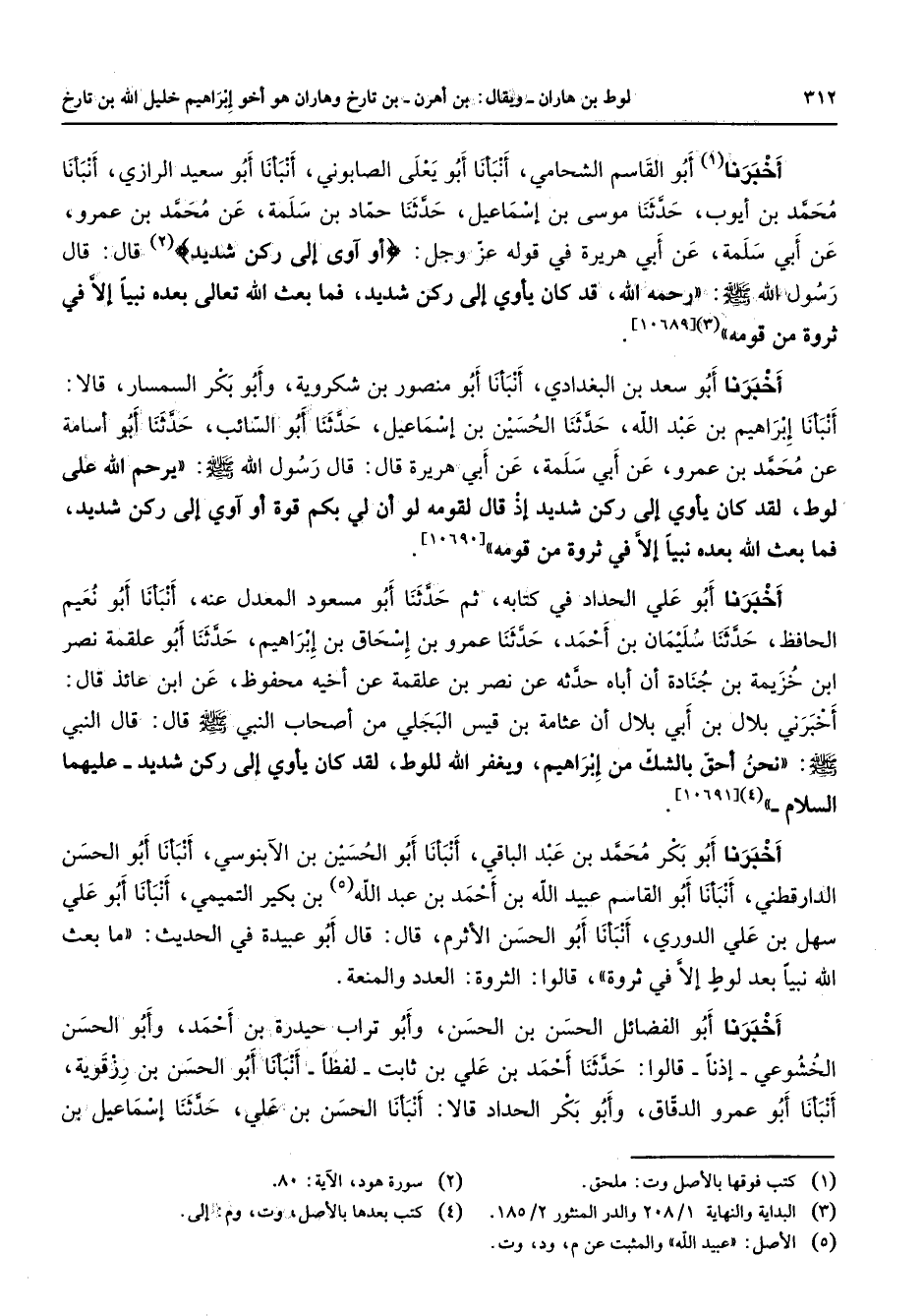 [10690] أخبرنا أبو علي الحداد في كتابه ثم حدثنا أبو مسعود المعدل عنه أنبأنا أبو نعيم الحافظ حدثنا سليمان بن أحمد حدثنا عمرو بن إسحاق بن إبراهيم حدثنا أبو علقمة نصر ابن خزيمة بن جنادة أن أباه حدثه عن نصر بن علقمة عن أخيه محفوظ عن ابن عائذ قال أخبرني بلال بن أبي بلال أن عثامة بن قيس البجلي من أصحاب النبي (صلى الله عليه وسلم) قال قال النبي (صلى الله عليه وسلم) نحن أحق بالشك من إبراهيم ويغفر الله للوط لقد كان يأوي إلى ركن شديد عليهما السلام (4)