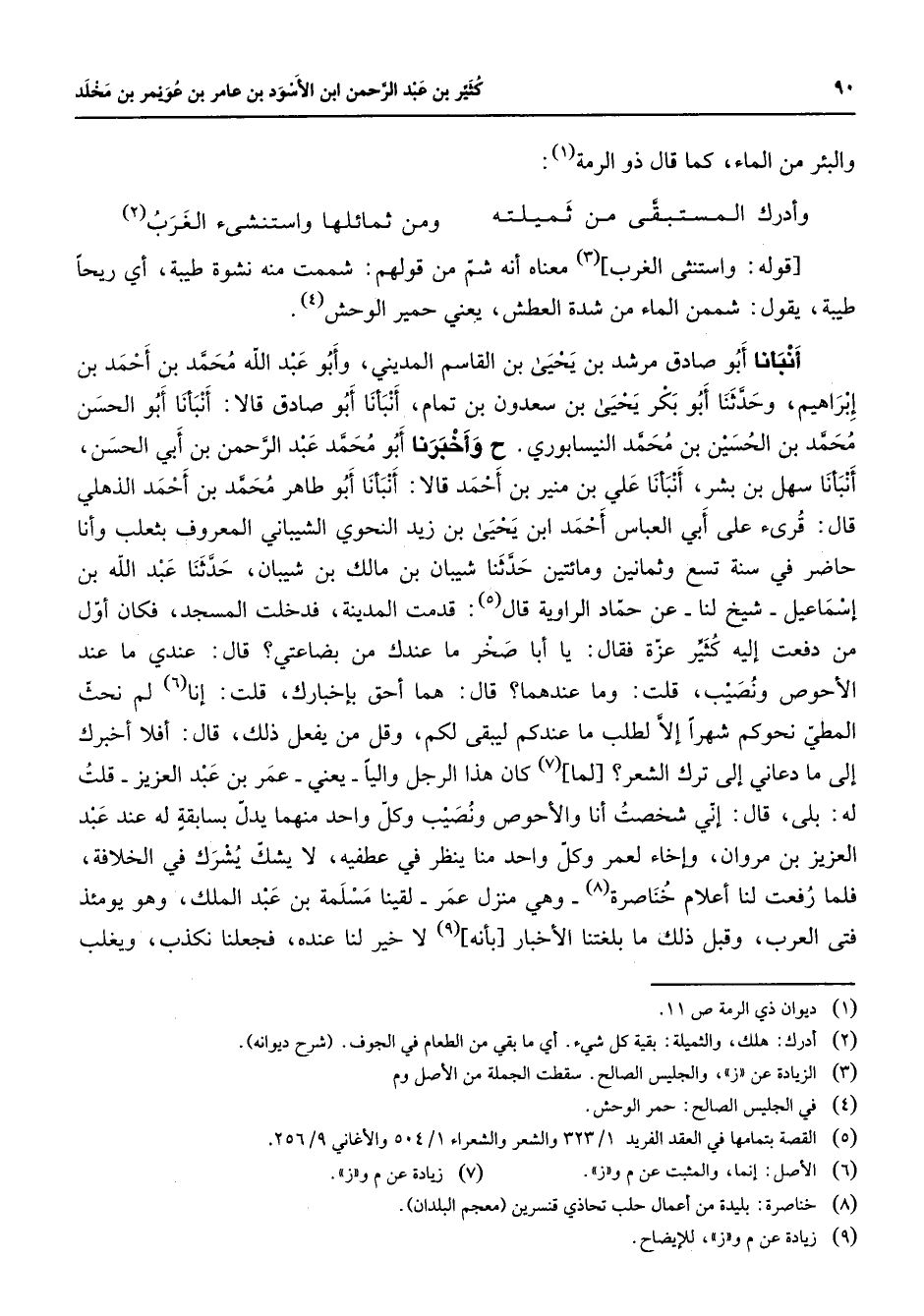 والبئر من الماء كما قال ذو الرمة (1) : وأدرك المستبقى من ثميلته * ومن ثمائلها واستنشئ الغرب (2) قوله واستثنى الغرب (3) معناه أنه شم من قولهم شممت منه نشوة طيبة أي ريحا طيبة يقول شممن الماء من شدة العطش يعني حمير الوحش (4) أنبأنا أبو صادق مرشد بن يحيى بن القاسم المديني وأبو عبد الله محمد بن أحمد بن إبراهيم وحدثنا أبو بكر يحيى بن سعدون بن تمام أنبأنا أبو صادق قالا أنبأنا أبو الحسن محمد بن الحسين بن محمد النيسابوري ح وأخبرنا أبو محمد عبد الرحمن بن أبي الحسن أنبأنا سهل بن بشر أنبأنا علي بن منير بن أحمد قالا أنبأنا أبو طاهر محمد بن أحمد الذهلي قال قرئ على أبي العباس أحمد بن يحيى بن زيد النحوي الشيباني المعروف بثعلب وأنا حاضر في سنة تسع وثمانين ومائتين حدثنا شيبان بن مالك بن شيبان حدثنا عبد الله بن إسماعيل شيخ لنا عن حماد الرواية قال (5) قدمت المدينة فدخلت المسجد فكان أول من دفعت إليه كثير عزة فقال يا أبا صخر ما عندك من بضاعتي قال عندي ما عند الأحوص ونصيب قلت وما عندهما قال هما أحق بإخبارك قلت إنا (6) لم نحث المطي نحوكم شهرا غلا لطلب ما عندكم ليبقى لكم وقل من يفعل ذلك قال أفلا أخبرك إلى ما دعاني إلى ترك الشعر [لما] (7) كان هذا الرجل واليا يعني عمر بن عبد العزيز قلت له بلى قال إني شخصت أنا والأحوص ونصيب وكل واحد منهما يدل بسابقة له عند عبد العزيز بن مروان وإخاء لعمر وكل واحد منا ينظر في عطفيه لا يشك يشرك في الخلافة فلما رفعت لنا أعلام خناصرة (8) وهي منزل عمر لقينا مسلمة بن عبد الملك وهو يومئذ فتى العرب وقبل ذلك ما بلغتنا الأخبار [بأنه] (9) لا خير لنا عنده فجعلنا نكذب ويغلب