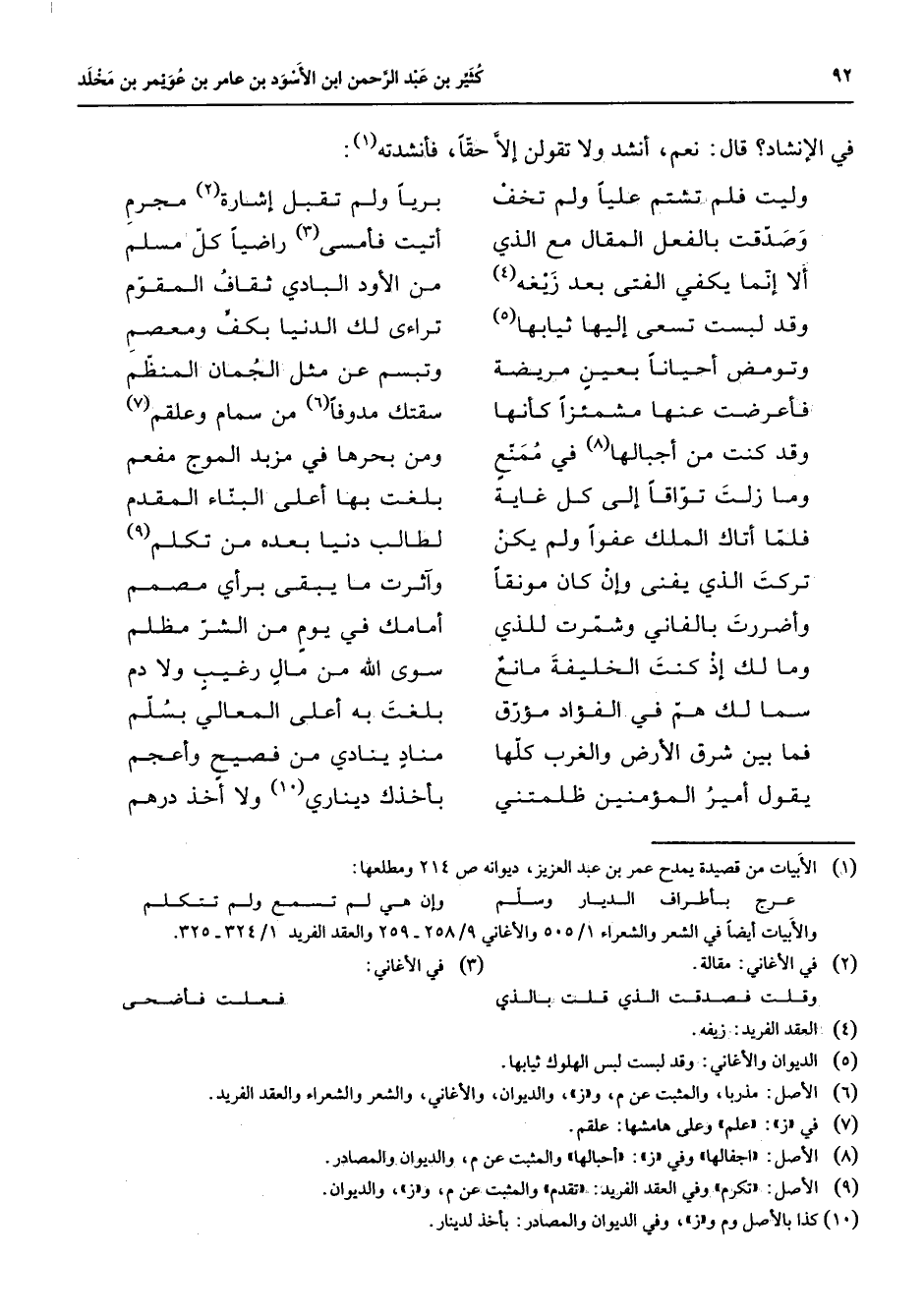 (1) الأبيات من قصيدة يمدح عمر بن عبد العزيز ديوانه ص 214 ومطعلها: عرج بأطراف الديار وسلم * وإن هي لم تسمع ولم تتكلم والأبيات أيضا في الشعر والشعراء 1 / 505 والأغاني 9 / 258 - 259 والعقد الفريد 1 / 324 - 325