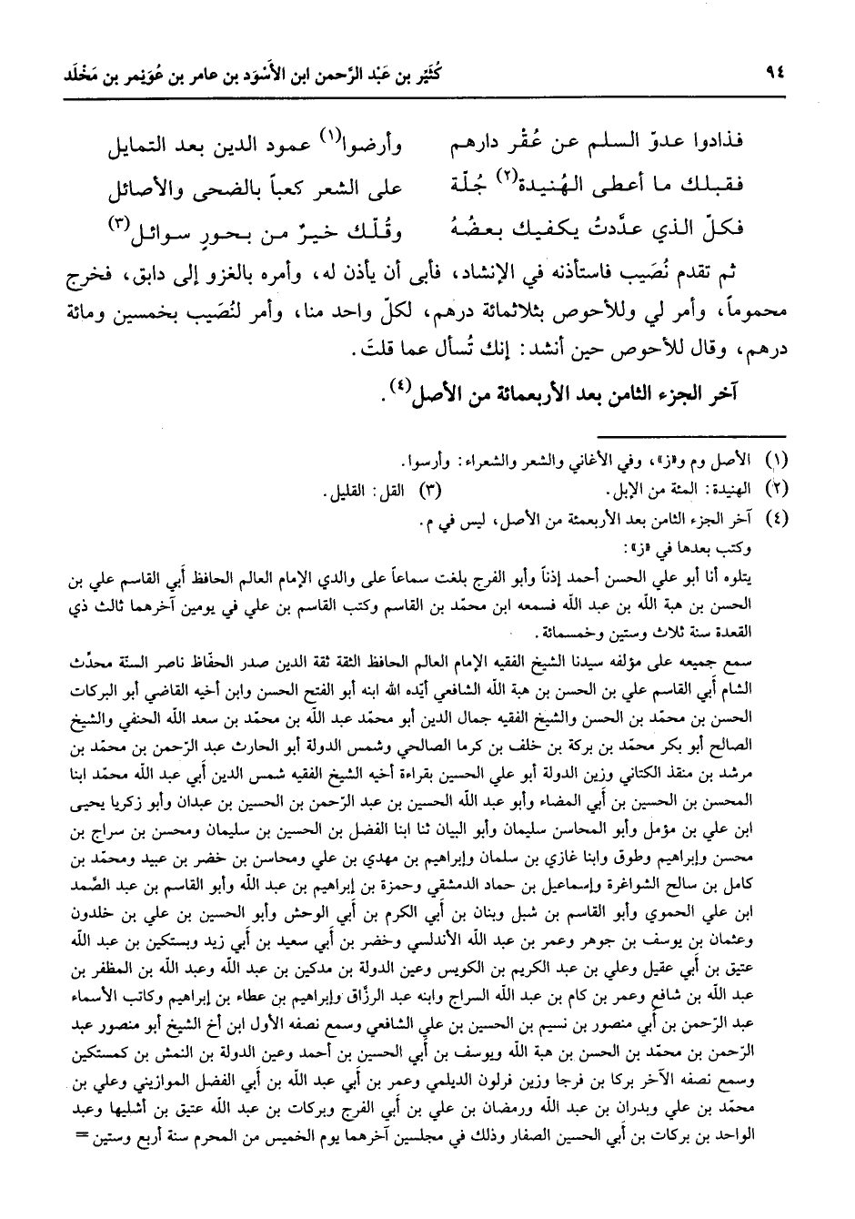 فذادوا عدو السلم عن عقر دارهم * وأرضوا (1) عمود الدين بعد التمايل فقبلك ما أعطى الهنيدة (2) جلة * على الشعر كعبا بالضحى والأصائل فكل الذي عددت يكفيك بعضه * وقلك خير من بحور سوائل (3) ثم تقدم نصيب فاستأذنه في الإنشاد فأبى أن يأذن له وأمره بالغزو إلى دابق فخرج محموما وأمر لي وللأحوص بثلاثمائة درهم لكل واحد منا وأمر لنصيب بخمسين ومائة درهم وقال للأحوص حين أنشد إنك تسأل عما قلت آخر الجزء الثامن بعد الأربعمائة من الأصل (4)