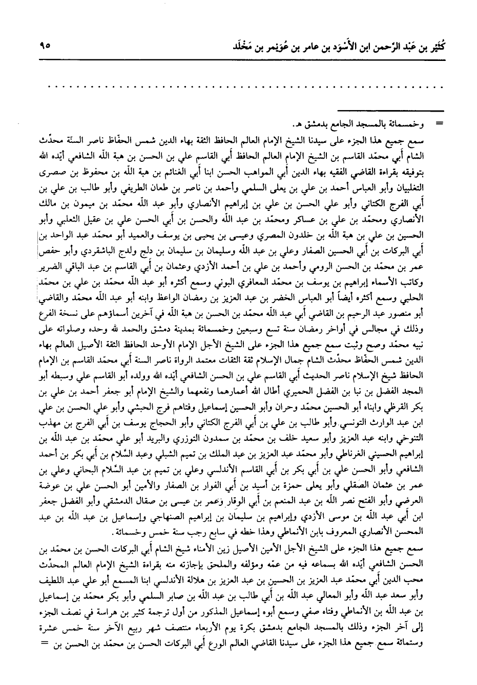 سمع جميع هذا الجزء على الشيخ الأجل الأمين الأصيل زين الأمناء شيخ الشام أبي البركات الحسن بن محمد بن الحسن الشافعي أيده الله بسماعه فيه من عمه ومؤلفه والملحق بإجازته منه بقراءة الشيخ الإمام العالم المحدث محب الدين أبي محمد عبد العزيز بن الحسين بن عبد العزيز بن هلالة الأندلسي ابنا المسمع أبو علي عبد اللطيف وأبو سعد عبد الله وأبو المعالي عبد الله بن أبي طالب بن عبد الله بن صابر السلمي وأبو بكر محمد بن إسماعيل بن عبد الله بن الأنماطي وفتاه صفي وسمع أبوه إسماعيل المذكور من أول ترجمة كثير بن هراسة في نصف الجزء إلى آخر الجزء وذلك بالمسجد الجامع بدمشق بكرة يوم الأربعاء منتصف شهر ربيع الآخر سنة خمس عشرة وستمائة سمع جميع هذا الجزء على سيدنا القاضي العالم الورع أبي البركات الحسن بن محمد بن الحسن بن