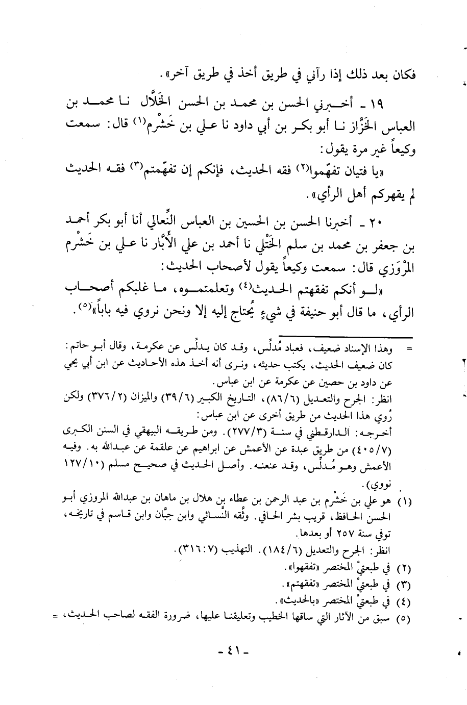 19 - أَخْبَرَنِي الْحَسَنُ بْنُ مُحَمَّدِ بْنِ الْحَسَنِ الْخَلَّالُ نَا مُحَمَّدُ بْنُ الْعَبَّاسِ الْخَزَّازُ نَا أَبُو بَكْرِ بْنُ أَبِي دَاوُدَ نَا عَلِيُّ بْنُ خَشْرَمٍ قَالَ سَمِعْتُ وَكِيعًا غير مرّة يَقُولُ يَا فِتْيَانُ تَفَهَّمُوا فِقْهَ الْحَدِيثِ فَإِنَّكُمْ إِنْ تَفَهَّمْتُمْ فِقْهَ الْحَدِيثِ لَمْ يَقْهَرْكُمْ أَهْلُ الرَّأْيِ