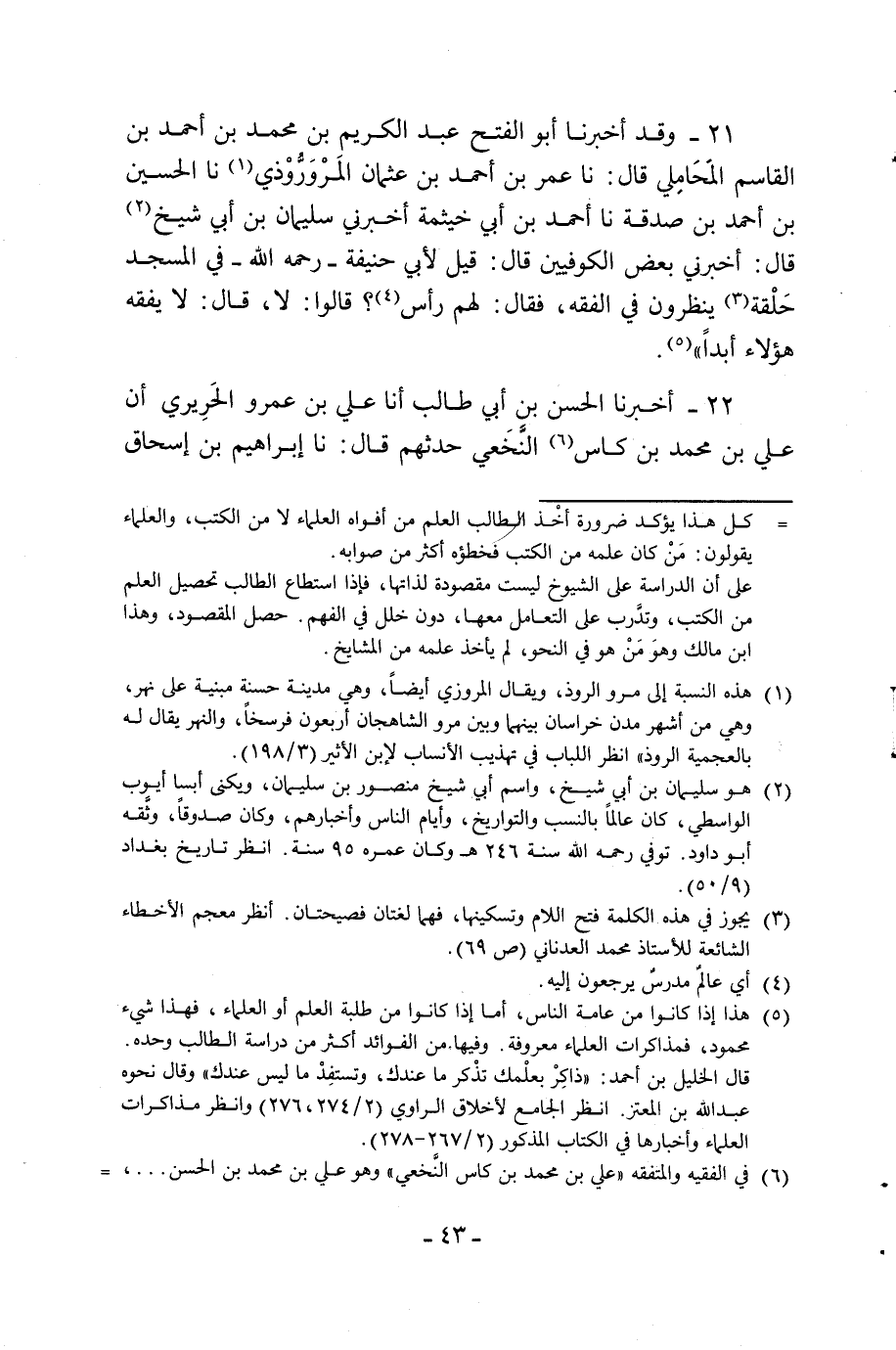 وَقَدْ أَخْبَرَنَا أَبُو الْفَتْحِ عَبْدُ الْكَرِيمِ بْنُ مُحَمَّدِ بْنِ أَحْمَدَ بن الْقسم الْمَحَامِلِيُّ قَالَ نَا عُمَرُ بْنُ أَحْمَدَ بْنِ عُثْمَانَ الْمَرْوَرُوذِيُّ نَا الْحُسَيْنُ بْنُ أَحْمَدَ بْنِ صَدَقَةَ نَا أَحْمَدُ بْنُ أَبِي خَيْثَمَةَ أَخْبَرَنِي سُلَيْمَانُ بْنُ أَبِي شَيْخٍ قَالَ أَخْبرنِي بعض الْكُوفِيّين قَالَ قِيلَ لِأَبِي حَنِيفَةَ رَحِمَهُ اللَّهُ فِي الْمَسْجِدِ حَلْقَةٌ يَنْظُرُونَ فِي الْفِقْهِ فَقَالَ لَهُمْ رَأْسٌ قَالُوا لَا قَالَ لَا يَفْقَهُ هَؤُلَاءِ أَبَدًا