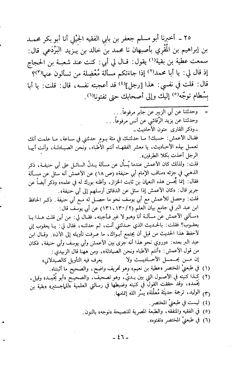 25 - أَخْبَرَنَا أَبُو مُسْلِمٍ جَعْفَرُ بْنُ بَابِيٍّ الْفَقِيهُ الْجِيلِيُّ انا أَبُو بَكْرٍ مُحَمَّدُ بْنُ إِبْرَاهِيمَ بْنِ الْمُقْرِي بِأَصْبَهَانَ نَا مُحَمَّدُ بْنُ خَالِد بن يزِيد البردعي قَالَ سَمِعْتُ عَطِيَّةَ بْنَ بَقِيَّةَ يَقُولُ قَالَ لِي أَبِي كُنْتُ عِنْدَ شُعْبَةَ بْنِ الْحَجَّاجِ إِذْ قَالَ لِي يَا أَبَا مُحَمَّدٍ إِذَا جَاءَتْكُمْ مَسْأَلَةٌ مُعْضِلَةٌ مَنْ تَسْأَلُونَ عَنْهَا قَالَ قُلْتُ فِي نَفْسِي هَذَا رَجُلٌ قَدْ أَعْجَبَتْهُ نَفْسُهُ قَالَ قُلْتُ يَا أَبَا بسطَام توجه إِلَيْك وَإِلَى أَصْحَابك حَتَّى تفوتونا