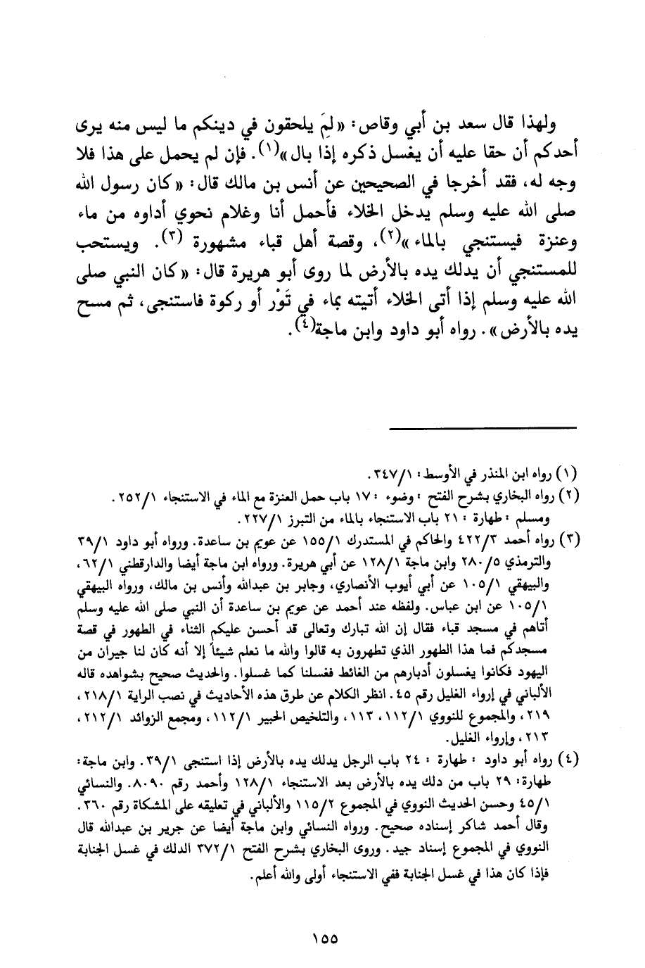 وَلِهَذَا قَالَ سَعْدُ بْنُ أَبِي وَقَّاصٍ: " لِمَ يُلْحِقُونَ فِي دِينِكُمْ مَا لَيْسَ مِنْهُ يَرَى أَحَدُكُمْ أَنَّ حَقًّا عَلَيْهِ أَنْ يَغْسِلَ ذَكَرَهُ إِذَا بَالَ " فَإِنْ لَمْ يُحْمَلْ عَلَى هَذَا فَلَا وَجْهَ لَهُ، فَقَدْ أَخْرَجَا فِي الصَّحِيحَيْنِ عَنْ أَنَسِ بْنِ مَالِكٍ قَالَ: " «كَانَ رَسُولُ اللَّهِ صَلَّى اللَّهُ عَلَيْهِ وَسَلَّمَ يَدْخُلُ الْخَلَاءَ فَأَحْمِلُ أَنَا وَغُلَامٌ نَحْوِي إِدَاوَةً مِنْ مَاءٍ وَعَنَزَةٍ فَيَسْتَنْجِي بِالْمَاءِ» "، وَقِصَّةُ أَهْلِ قُبَاءٍ مَشْهُورَةٌ. وَيُسْتَحَبُّ لِلْمُسْتَنْجِي أَنْ يُدَلِّكَ يَدَهُ بِالْأَرْضِ لِمَا رَوَى أَبُو هُرَيْرَةَ قَالَ: " «كَانَ النَّبِيُّ صَلَّى اللَّهُ عَلَيْهِ وَسَلَّمَ إِذَا أَتَى الْخَلَاءَ أَتَيْتُهُ بِمَاءٍ فِي تَوْرٍ أَوْ رَكْوَةٍ فَاسْتَنْجَى، ثُمَّ مَسَحَ يَدَهُ بِالْأَرْضِ» رَوَاهُ أَبُو دَاوُدَ وَابْنُ مَاجَهْ