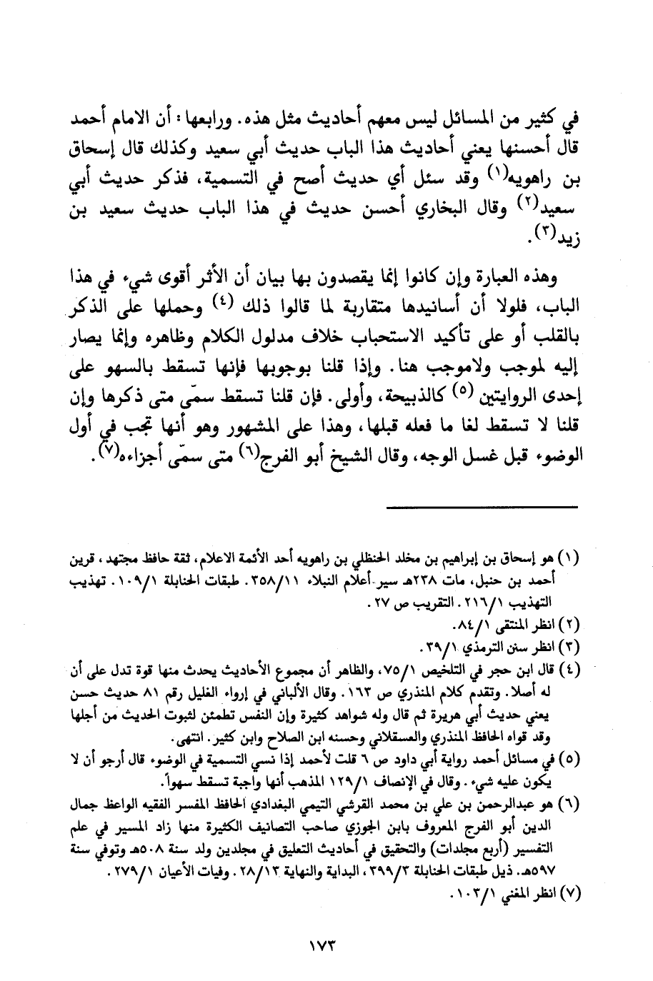 وَهَذِهِ الْعِبَارَةُ، وَإِنْ كَانُوا إِنَّمَا يَقْصِدُونَ بِهَا بَيَانَ أَنَّ الْأَثَرَ أَقْوَى شَيْءٍ فِي هَذَا الْبَابِ، فَلَوْلَا أَنَّ أَسَانِيدَهَا مُتَقَارِبَةٌ لَمَا قَالُوا ذَلِكَ وَحَمْلُهَا عَلَى الذِّكْرِ بِالْقَلْبِ أَوْ عَلَى تَأْكِيدِ الِاسْتِحْبَابِ خِلَافُ مَدْلُولِ الْكَلَامِ وَظَاهِرِهِ، وَإِنَّمَا يُصَارُ إِلَيْهِ لِمُوجِبٍ وَلَا مُوجِبَ هُنَا، وَإِذَا قُلْنَا بِوُجُوبِهَا فَإِنَّهَا تَسْقُطُ بِالسَّهْوِ عَلَى إِحْدَى الرِّوَايَتَيْنِ كَالذَّبِيحَةِ وَأَوْلَى، فَإِنْ قُلْنَا تَسْقُطُ سَمَّى مَتَى ذَكَرَهَا، وَإِنْ قُلْنَا: لَا تَسْقُطُ لَغَا مَا فَعَلَهُ قَبْلَهَا، وَهَذَا عَلَى الْمَشْهُورِ، وَهُوَ أَنَّهَا تَجِبُ فِي أَوَّلِ الْوُضُوءِ قَبْلَ غَسْلِ الْوَجْهِ، وَقَالَ الشَّيْخُ أَبُو الْفَرَجِ: مَتَّى سَمَّى أَجْزَأَهُ.