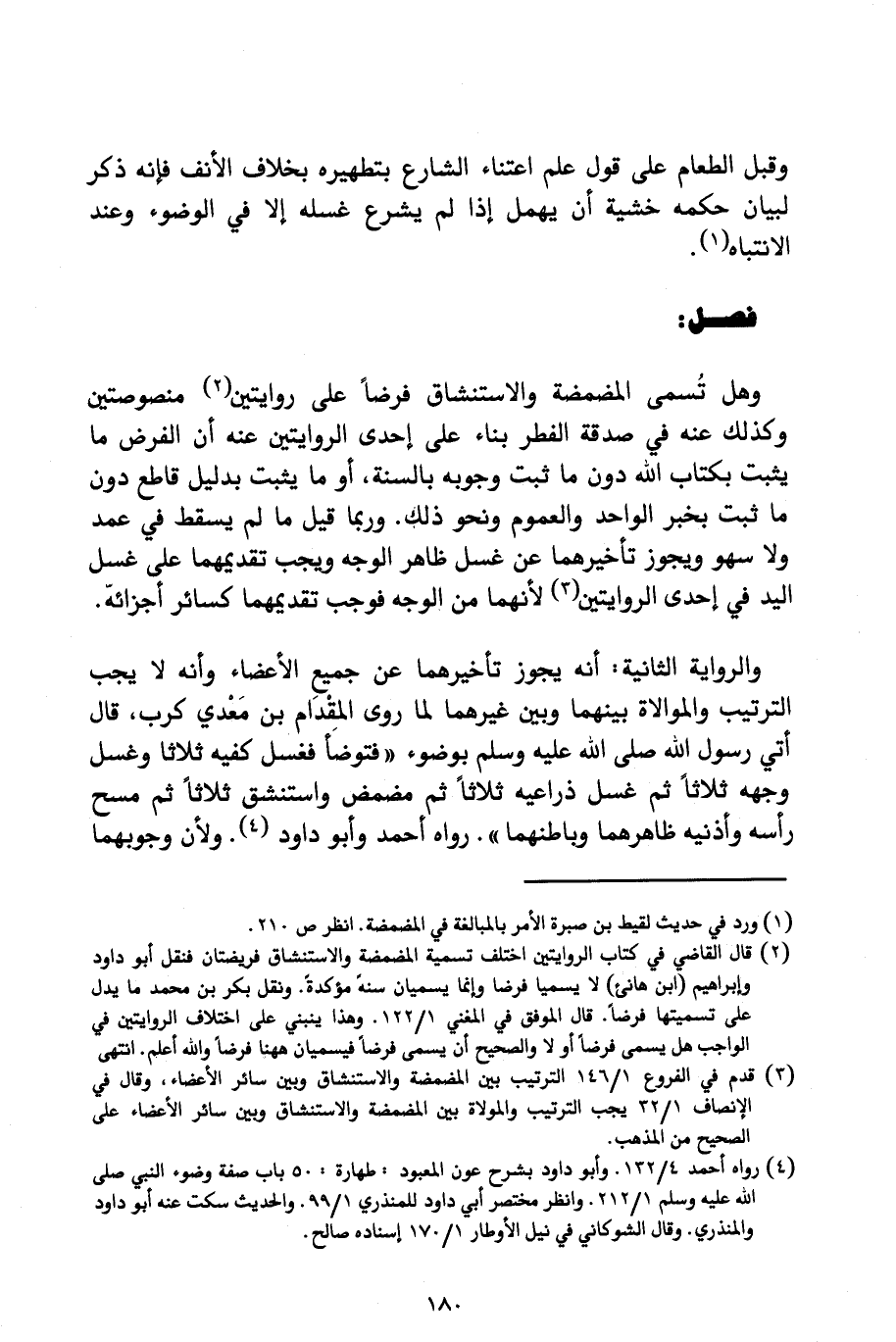 وَهَلْ تُسَمَّى الْمَضْمَضَةُ وَالِاسْتِنْشَاقُ فَرْضًا عَلَى رِوَايَتَيْنِ مَنْصُوصَتَيْنِ، وَكَذَلِكَ عَنْهُ فِي صَدَقَةِ الْفِطْرِ بِنَاءً عَلَى إِحْدَى الرِّوَايَتَيْنِ عَنْهُ أَنَّ الْفَرْضَ مَا يَثْبُتُ بِكِتَابِ اللَّهِ دُونَ مَا ثَبَتَ وُجُوبُهُ بِالسُّنَّةِ، أَوْ مَا يَثْبُتُ بِدَلِيلٍ قَاطِعٍ دُونَ مَا ثَبَتَ بِخَبَرِ الْوَاحِدِ وَالْعُمُومِ وَنَحْوِ ذَلِكَ. وَرُبَّمَا قِيلَ: مَا لَمْ يَسْقُطْ فِي عَمْدٍ وَلَا سَهْوٍ، وَيَجُوزُ تَأْخِيرُهُمَا عَنْ غَسْلِ ظَاهِرِ الْوَجْهِ، وَيَجِبُ تَقْدِيمُهُمَا عَلَى غَسْلِ الْيَدِ فِي إِحْدَى الرِّوَايَتَيْنِ؛ لِأَنَّهُمَا مِنَ الْوَجْهِ فَوَجَبَ تَقْدِيمُهُمَا كَسَائِرِ أَجْزَائِهِ.