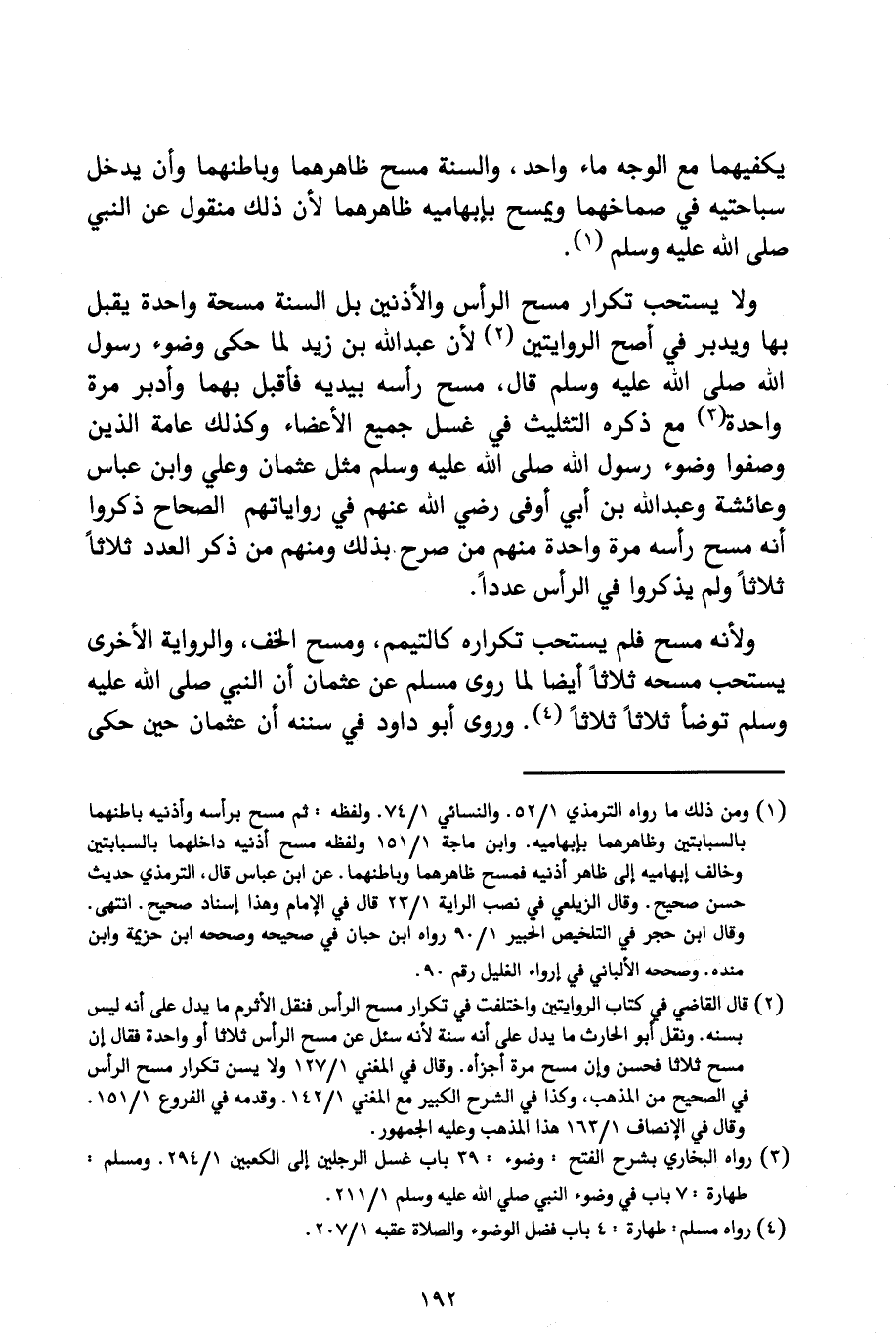 وَلَا يُسْتَحَبُّ تَكْرَارُ مَسْحِ الرَّأْسِ وَالْأُذُنَيْنِ بَلِ السُّنَّةُ مَسْحَةٌ وَاحِدَةٌ يُقْبِلُ بِهَا وَيُدْبِرُ فِي أَصَحِّ الرِّوَايَتَيْنِ؛ لِأَنَّ عَبْدَ اللَّهِ بْنَ زَيْدٍ لَمَّا حَكَى وُضُوءَ رَسُولِ اللَّهِ صَلَّى اللَّهُ عَلَيْهِ وَسَلَّمَ قَالَ: مَسَحَ رَأْسَهُ بِيَدَيْهِ فَأَقْبَلَ بِهِمَا وَأَدْبَرَ مَرَّةً وَاحِدَةً مَعَ ذِكْرِهِ التَّثْلِيثَ فِي غَسْلِ جَمِيعِ الْأَعْضَاءِ وَكَذَلِكَ عَامَّةُ الَّذِينَ وَصَفُوا وُضُوءَ رَسُولِ اللَّهِ صَلَّى اللَّهُ عَلَيْهِ وَسَلَّمَ مِثْلُ عُثْمَانَ وَعَلِيٍّ وَابْنِ عَبَّاسٍ وَعَائِشَةَ وَعَبْدِ اللَّهِ بْنِ أَبِي أَوْفَى رَضِيَ اللَّهُ عَنْهُمْ فِي رِوَايَاتِهِمُ الصِّحَاحِ ذَكَرُوا أَنَّهُ مَسَحَ رَأْسَهُ مَرَّةً وَاحِدَةً، مِنْهُمْ مَنْ صَرَّحَ بِذَلِكَ وَمِنْهُمْ مَنْ ذَكَرَ الْعَدَدَ ثَلَاثًا ثَلَاثًا وَلَمْ يَذْكُرُوا فِي الرَّأْسِ عَدَدًا.
