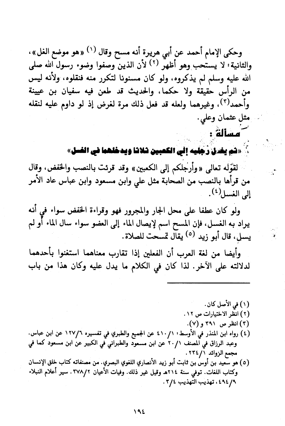 لِقَوْلِهِ تَعَالَى: {وَأَرْجُلَكُمْ إِلَى الْكَعْبَيْنِ} [المائدة: 6] وَقَدْ قُرِئَتْ بِالنَّصْبِ وَالْخَفْضِ، وَقَالَ مَنْ قَرَأَهَا بِالنَّصْبِ مِنَ الصَّحَابَةِ مِثْلُ عَلِيٍّ وَابْنِ مَسْعُودٍ وَابْنِ عَبَّاسٍ أَعَادَ الْأَمْرَ إِلَى الْغَسْلِ.