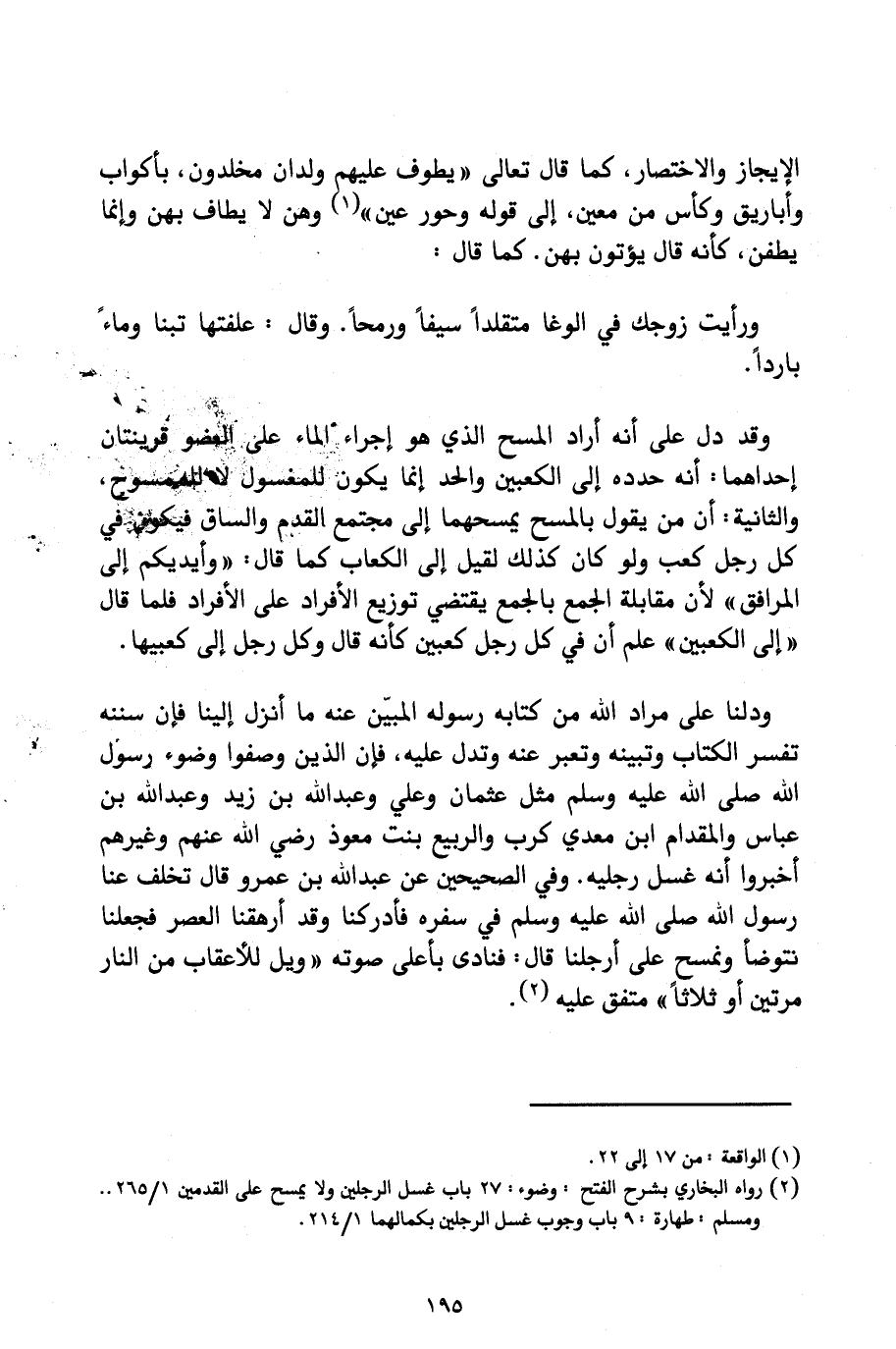 وَفِي الصَّحِيحَيْنِ عَنْ عَبْدِ اللَّهِ بْنِ عَمْرٍو قَالَ: «تَخَلَّفَ عَنَّا رَسُولُ اللَّهِ صَلَّى اللَّهُ عَلَيْهِ وَسَلَّمَ فِي سَفْرَةٍ فَأَدْرَكَنَا، وَقَدْ أَرْهَقَنَا الْعَصْرُ فَجَعَلْنَا نَتَوَضَّأُ وَنَمْسَحُ عَلَى أَرْجُلِنَا، قَالَ: فَنَادَى بِأَعْلَى صَوْتِهِ " وَيْلٌ لِلْأَعْقَابِ مِنَ النَّارِ مَرَّتَيْنِ أَوْ ثَلَاثًا» مُتَّفَقٌ عَلَيْهِ.