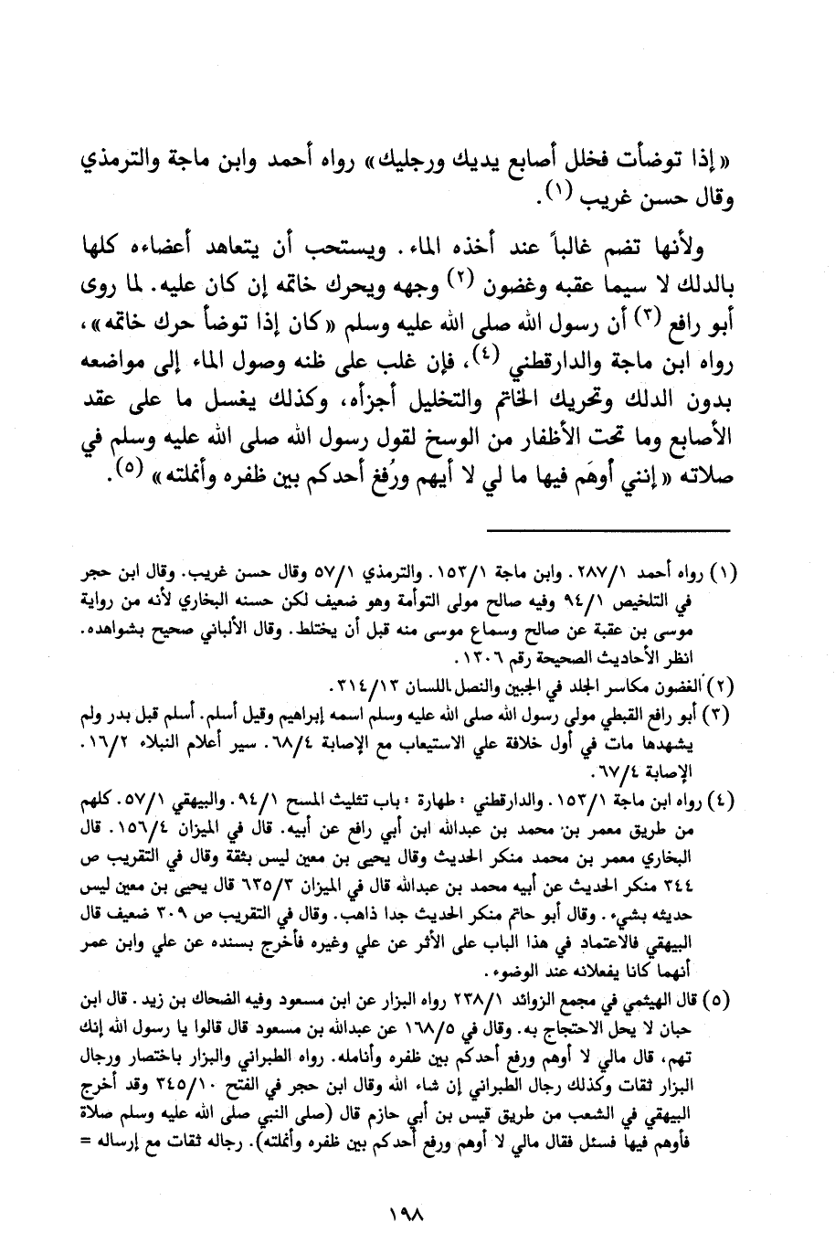 وَلِأَنَّهَا تُضَمُّ غَالِبًا عِنْدَ أَخْذِهِ الْمَاءَ. وَيُسْتَحَبُّ أَنْ يَتَعَاهَدَ أَعْضَاءَهُ كُلَّهَا بِالدَّلْكِ لَا سِيَّمَا عَقِبُهُ وَغُضُونُ وَجْهِهِ وَيُحَرِّكُ خَاتَمَهُ إِنْ كَانَ عَلَيْهِ؛ لِمَا رَوَى أَبُو رَافِعٍ أَنَّ رَسُولَ اللَّهِ صَلَّى اللَّهُ عَلَيْهِ وَسَلَّمَ " «كَانَ إِذَا تَوَضَّأَ حَرَّكَ خَاتَمَهُ» " رَوَاهُ ابْنُ مَاجَهْ وَالدَّارَقُطْنِيُّ، فَإِنْ غَلَبَ عَلَى ظَنِّهِ وُصُولُ الْمَاءِ إِلَى مَوَاضِعِهِ بِدُونِ الدَّلْكِ وَتَحْرِيكِ الْخَاتَمِ وَالتَّخْلِيلِ أَجْزَأَهُ، وَكَذَلِكَ يَغْسِلُ مَا عَلَى عُقَدِ الْأَصَابِعِ وَمَا تَحْتَ الْأَظْفَارِ مِنَ الْوَسَخِ؛ لِقَوْلِ رَسُولِ اللَّهِ صَلَّى اللَّهُ عَلَيْهِ وَسَلَّمَ فِي صَلَاتِهِ " «إِنَّنِي أُوهَمُ فِيهَا مَا لِي لَا أَهِمُ وَرُفْغُ أَحَدِكُمْ بَيْنَ ظُفْرِهِ وَأُنْمُلَتِهِ» ".