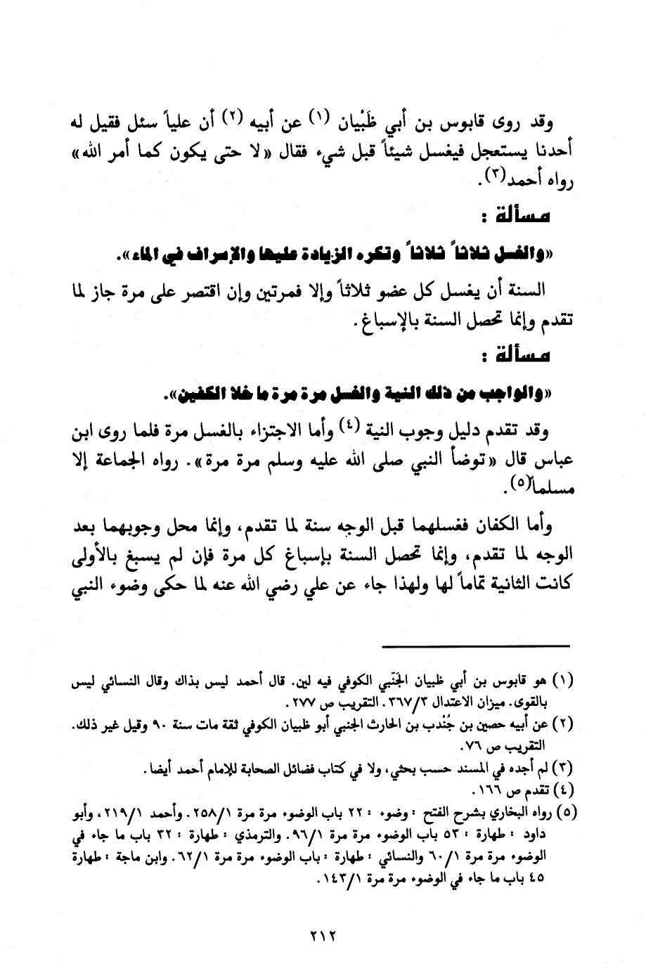 وَقَدْ رَوَى قَابُوسُ بْنُ أَبِي ظِبْيَانَ عَنْ أَبِيهِ أَنَّ عَلِيًّا سُئِلَ فَقِيلَ لَهُ أَحَدُنَا يَسْتَعْجِلُ فَيَغْسِلُ شَيْئًا قَبْلَ شَيْءٍ؟ فَقَالَ: " لَا حَتَّى يَكُونَ كَمَا أَمَرَ اللَّهُ " رَوَاهُ أَحْمَدُ.