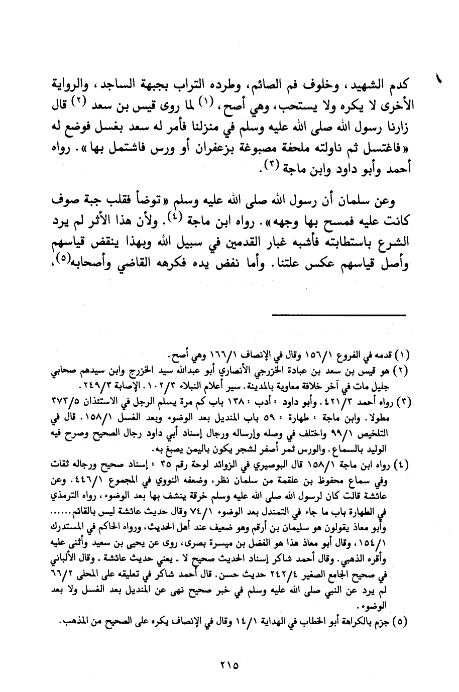 وَعَنْ سَلْمَانَ أَنَّ رَسُولَ اللَّهِ صَلَّى اللَّهُ عَلَيْهِ وَسَلَّمَ " «تَوَضَّأَ فَقَلَبَ جُبَّةَ صُوفٍ كَانَتْ عَلَيْهِ فَمَسَحَ بِهَا وَجْهَهُ» ". رَوَاهُ ابْنُ مَاجَهْ؛ وَلِأَنَّ هَذَا الْأَثَرَ لَمْ يَرِدِ الشَّرْعُ بِاسْتِطَابَتِهِ فَأَشْبَهَ غُبَارَ الْقَدَمَيْنِ فِي سَبِيلِ اللَّهِ، وَبِهَذَا يُنْقَضُ قِيَاسُهُمْ، وَأَصْلُ قِيَاسِهِمْ عَكْسُ عِلَّتِنَا. وَأَمَّا نَفْضُ يَدِهِ فَكَرِهَهُ الْقَاضِي وَأَصْحَابُهُ.